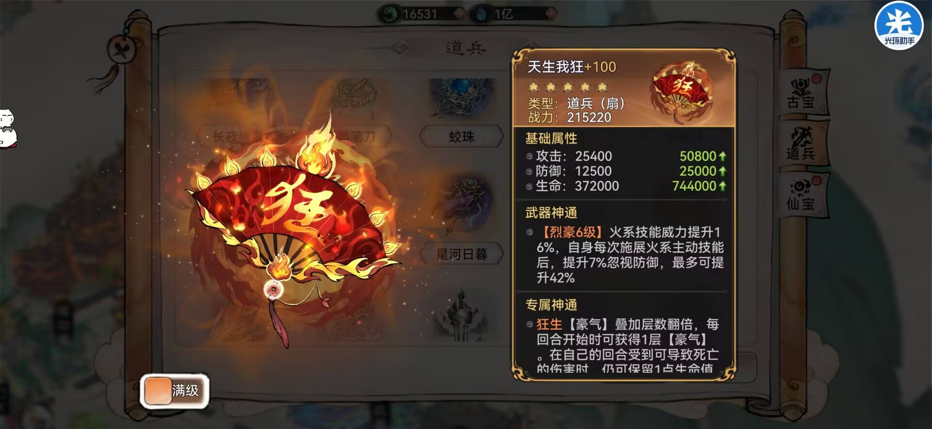 解析:咏梅这把道兵提升的法伤,满星后最大可以提升10%法伤,还可以通过负面提升法伤每层负面可以提升6%法伤,最大可以叠加5层。