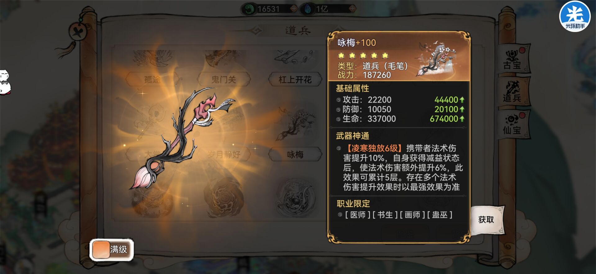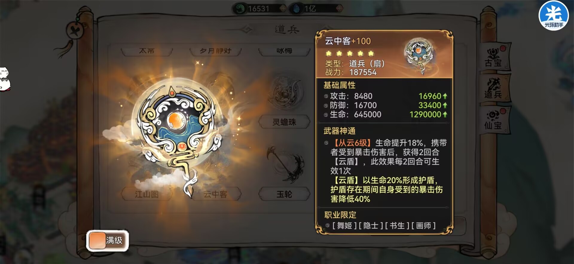 是阿璃、蛊队、画师这些弟子必备的道兵,佩戴以后可以提升伤害和命中,从而让弟子的伤害和技能命中率更高。