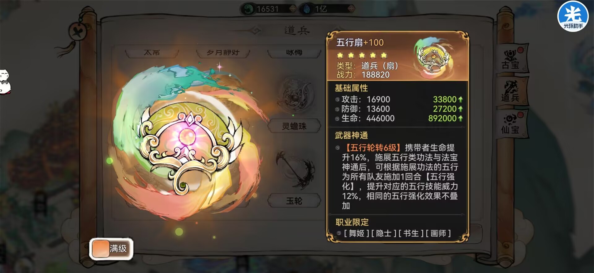 解析:五行扇基础提升的是生命,效果是可以提升队友的五行威力加成,因此比较适合辅助去带,所以一般情况下都是唐蝶衣、画师、云瑶这些辅助弟子去佩戴的道兵。