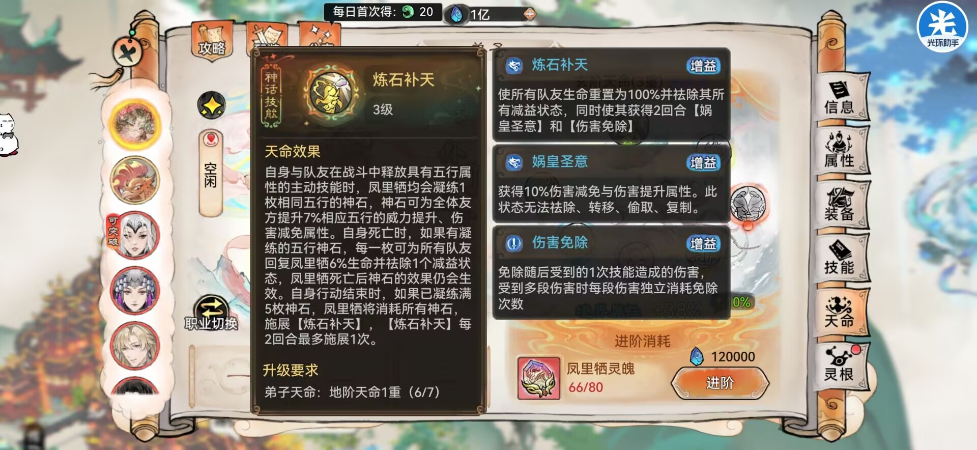 3:其次也可以给队伍提高生存复活和输出效果神话天命【练石补天】可以提升队友的五行威力、伤害减免、伤害增强、伤害抵挡等效果。