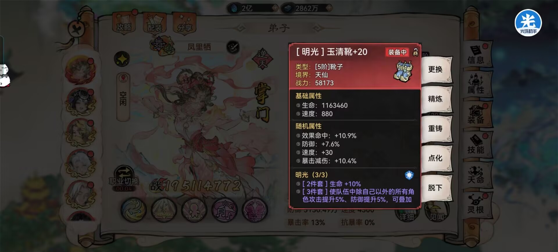 解析:如果命中和速度不够就选择【云歌套】凤里牺还是需要推命中的,比如针对敌方速攻阵容画师的时候,洞悉对面画师的再动,然后反手打出控制,释放法宝技能或者控制类的功法打乱敌人的进攻节奏,这点在目前版本是致命的,因为现在大家伤害都很高,只要被控制1回合就会直接被秒杀。