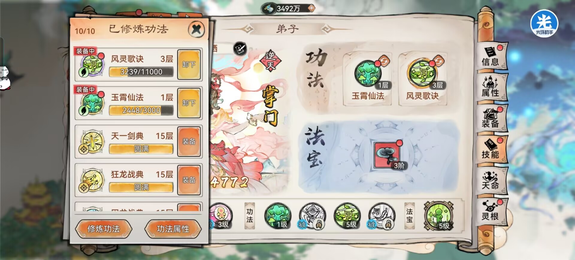 ②如果是想给队友单纯拉增益可以带【鸣金歌决】【大荒兽决】进行增益提升属性,还可以补齐五行神石。