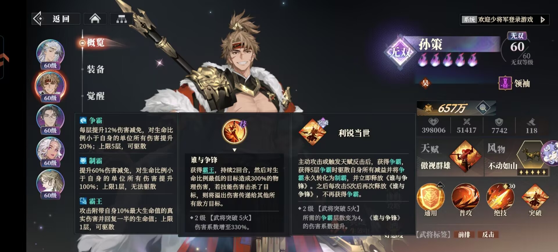 ⑤孙策:输出位。能抗能打争霸叠满以后触发的《谁与争锋》可以轻松带走任何一个敌人。