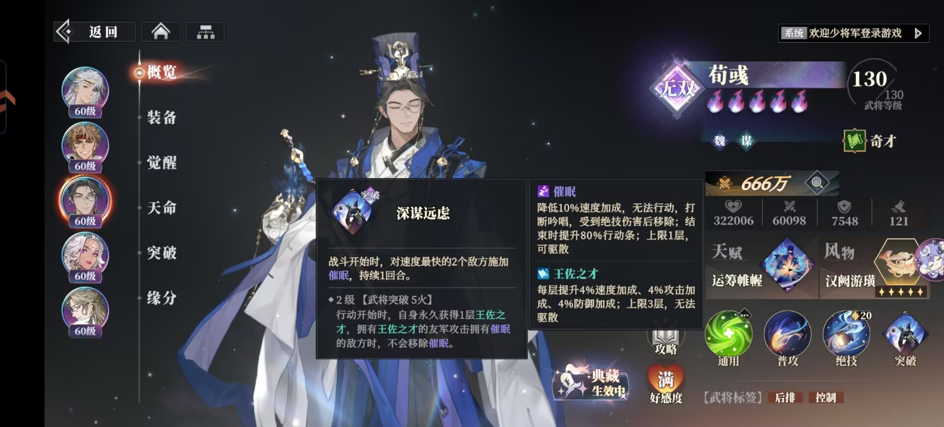 ③荀彧:控制增益位。和司马懿是绝配,自身的控制可以给司马懿增伤和快速叠被动,并且荀彧速度很快开局就可以给敌方速度最快的2名武将挂催眠控制,大招还可以优先锁定c位催眠控制,天赋还可以提升队友的三维属性加强作战能力。