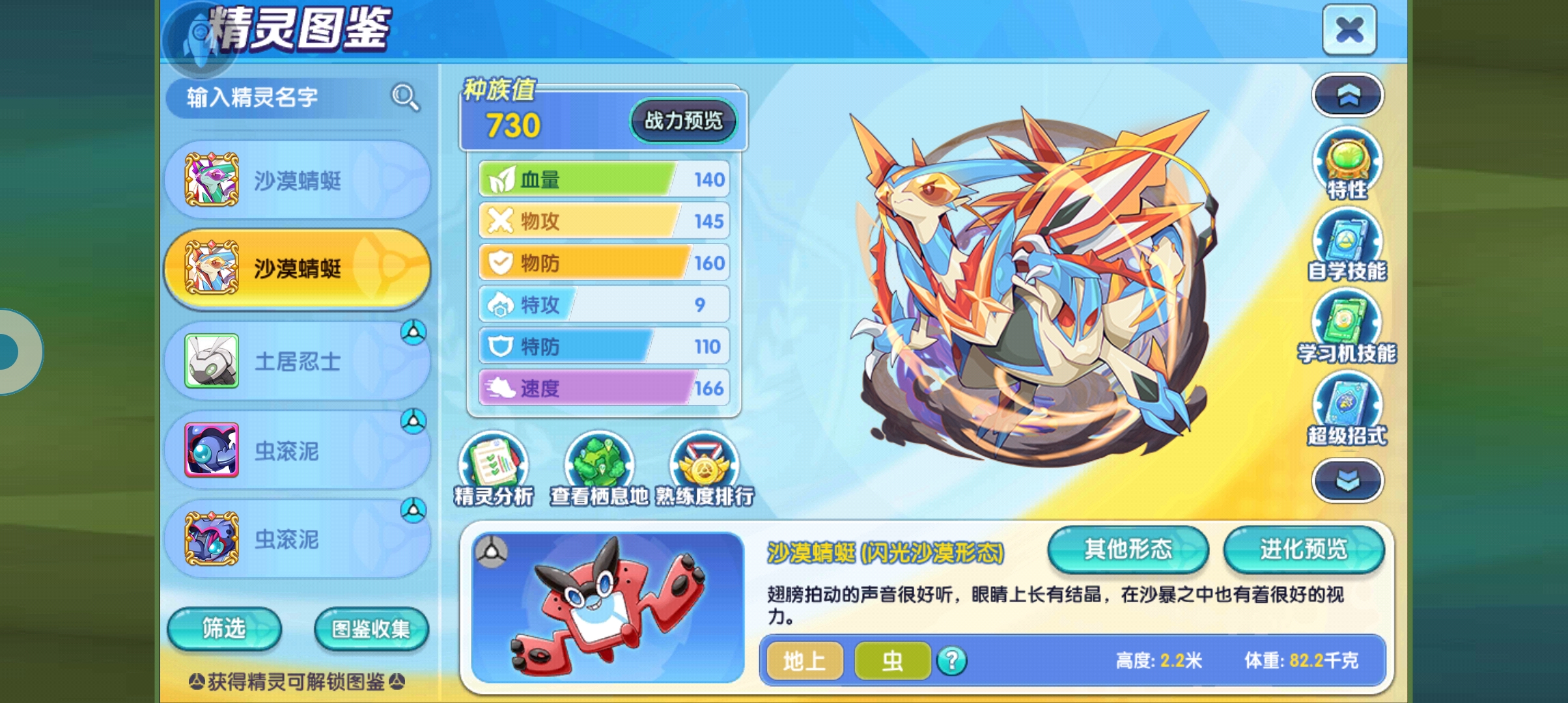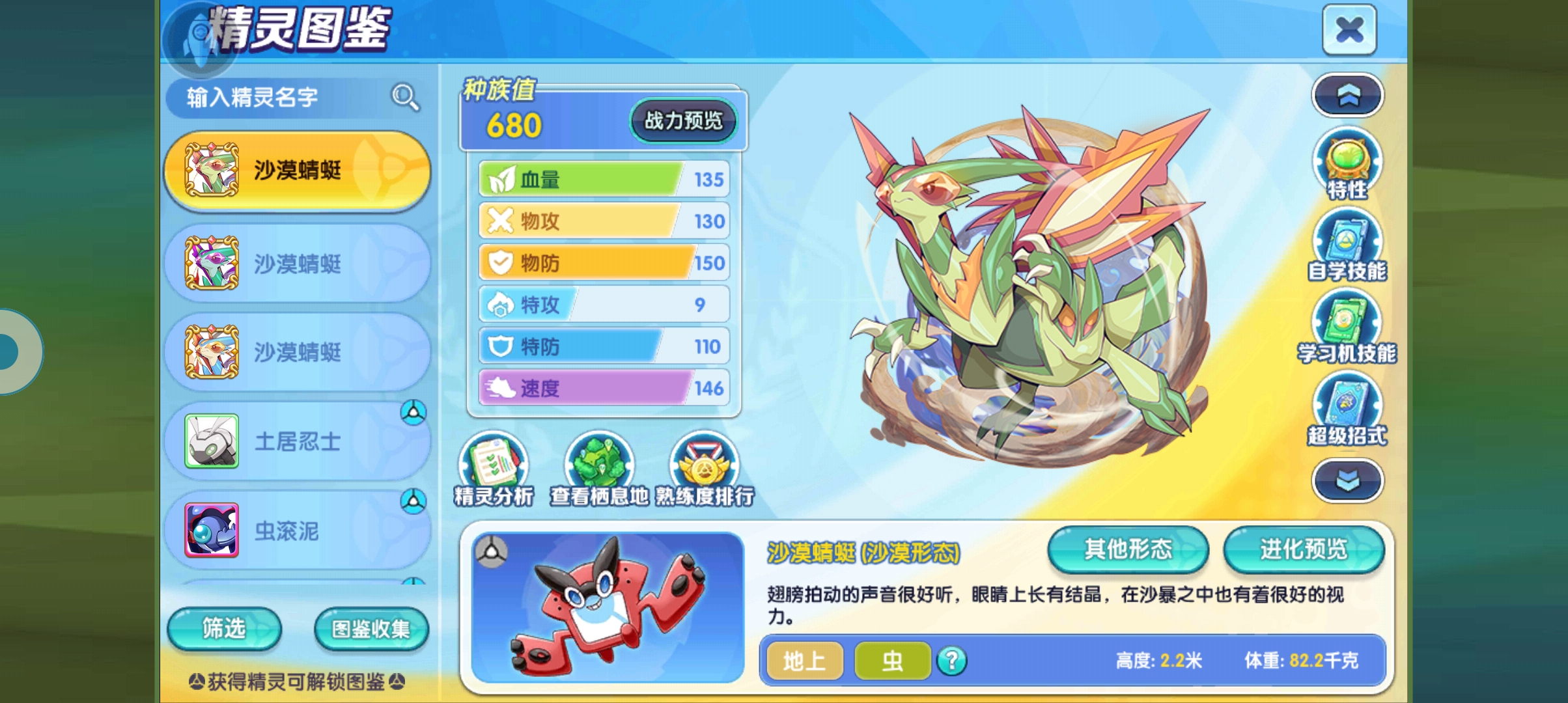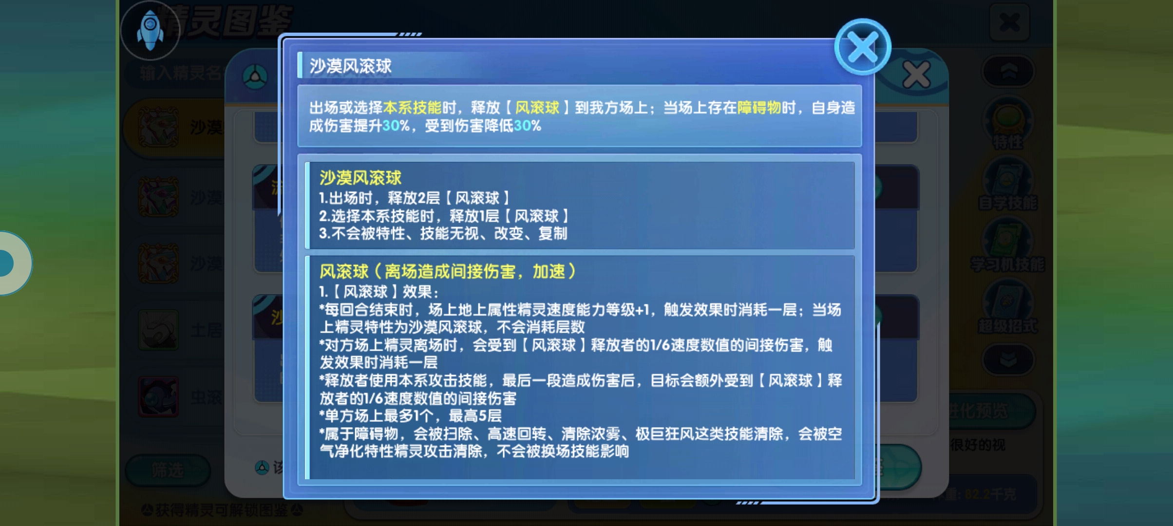 自身的特性也是在测试服期间改了很多遍,最后定版的就是这一版了,风滚球也是一种障碍物,所以他自身出场的时候就可以获得30%的减伤和加伤,一共能够拥有五层状态,当对面下场的时候就消耗一层给予对方特性,使用者1/6速度的间接伤害,所以我才说这个精灵,它的速度线越快越有优势,同时会消耗一层该状态,也就是说,假设自身队伍是打这种劝退机制的话,那么沙漠蜻蜓上场之后就可以释放该状态,然后上别的队友将对方给弄下场对方不仅下场了,还会受到间接伤害,可以说是相当的恶心,后面会在视频当中演示到。