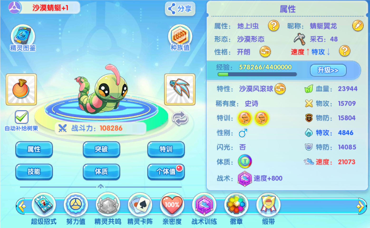 这边建议共鸣精灵,一定要选择增加速度的精灵最好,大家可以看到我这个面板是极限加速了,血量的话,差一点突破2万4,如果加上共鸣,就可以突破这个上限,突破到2万5不是问题,不过也要看共鸣精灵,他的血量种族如何?其他方面的话就比较的平均了,由于本身的机制是利用风滚球打伤害,所以自身的基础伤害的话是不高的,两种防御能力的话,分别是15000和14000略显低迷,但是这也是没办法的,不过呢,可以利用自身的专属和特性效果分别减伤。