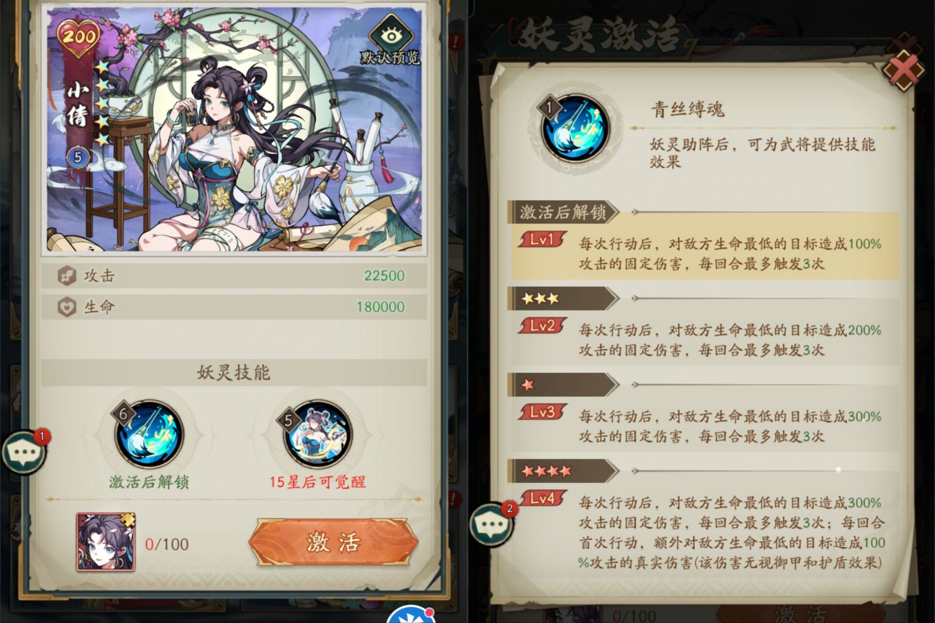 佩戴小倩以后每次行动最大可以对敌方生命最低的目标造成300%攻击的固定伤害。