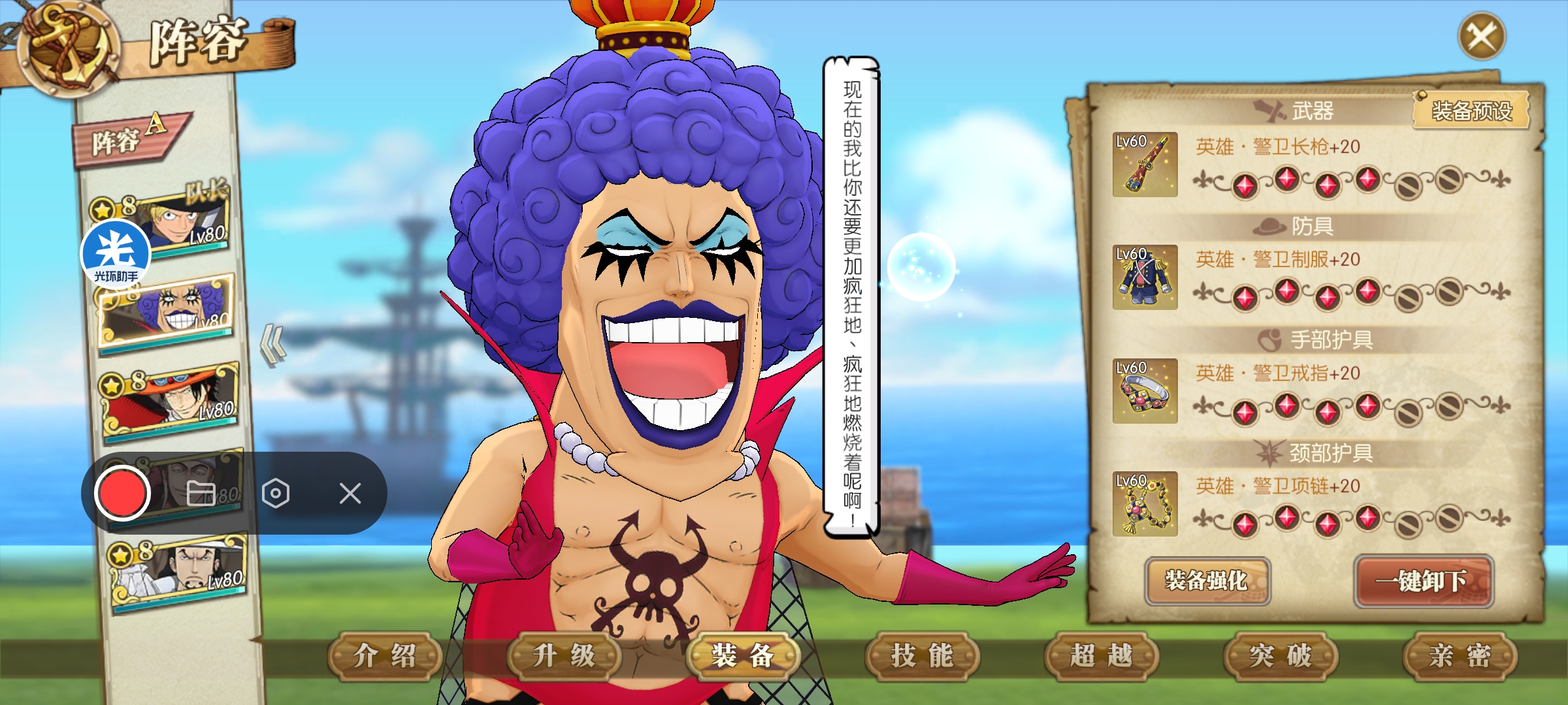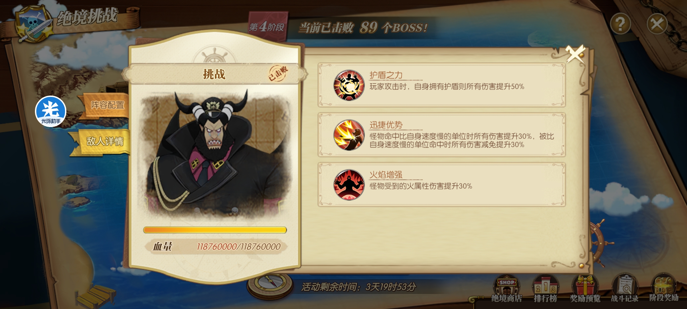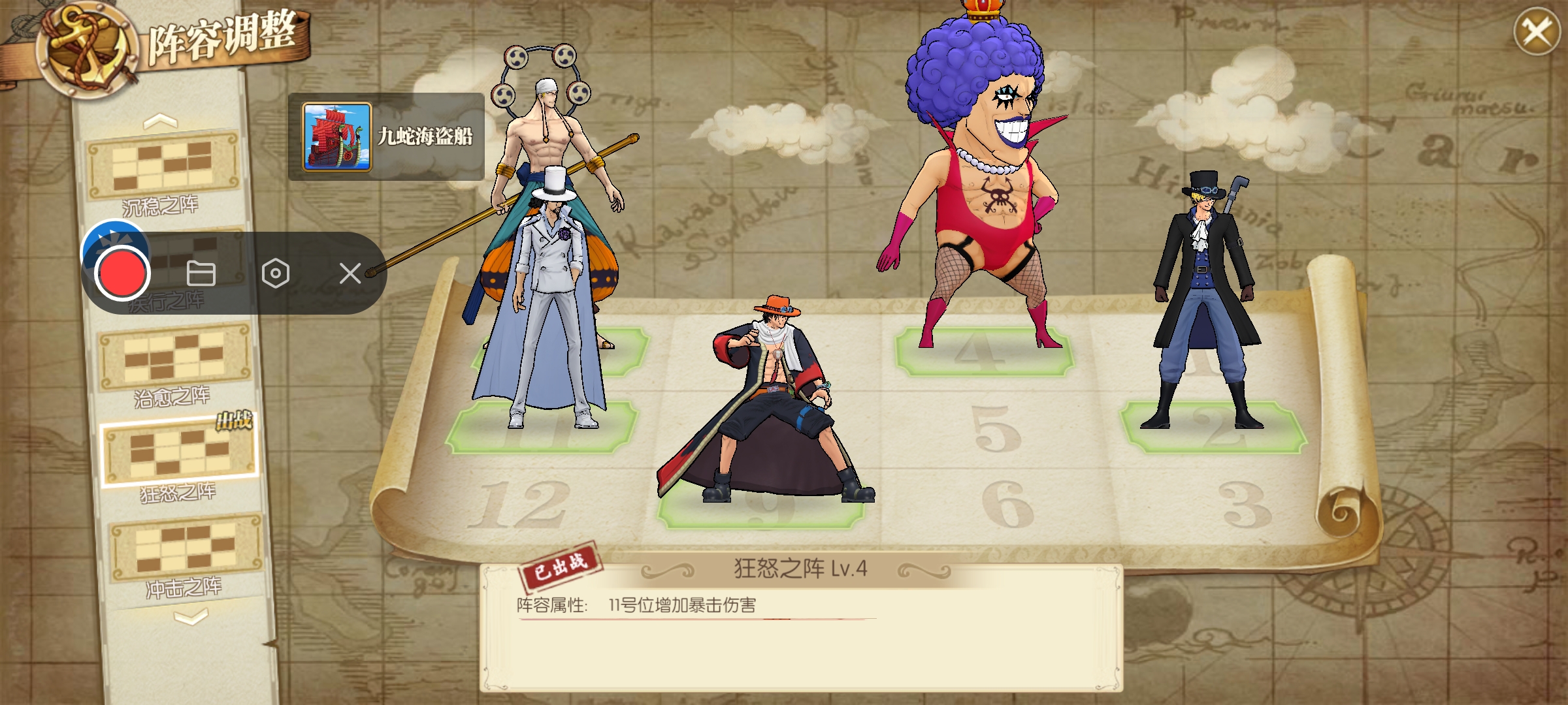 打法:萨博一速,也是这套阵容目前的核心输出。艾斯主打火伤,艾尼路辅助增强属伤,同时觉醒雷神本身的伤害也很高,我这里用的是觉醒一雷神。新世界豹子带两个主动加一个终结和奥义,主动带一个使终结眩晕的技能。人妖王辅助回血,同时给萨博加buff。阵容思路:艾斯和萨博主打火伤,艾斯和人妖王都可以给萨博增伤,艾尼路全员增伤,新世界豹子主打奥义和后期控制。如果第八回合没有完成击杀,只要麦哲伦或者小兵行动,直接就给我们团灭了,所以控制伤害很重要。如果伤害不够,建议带两个控制。
