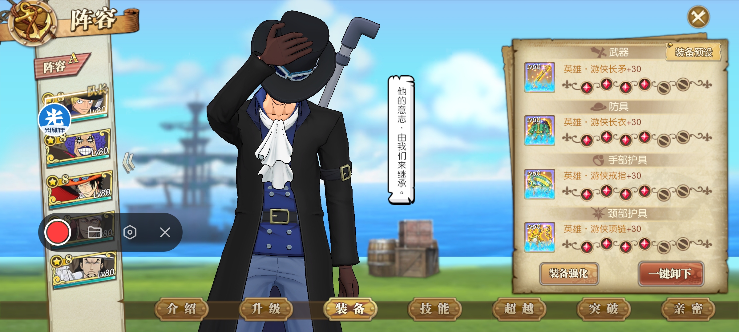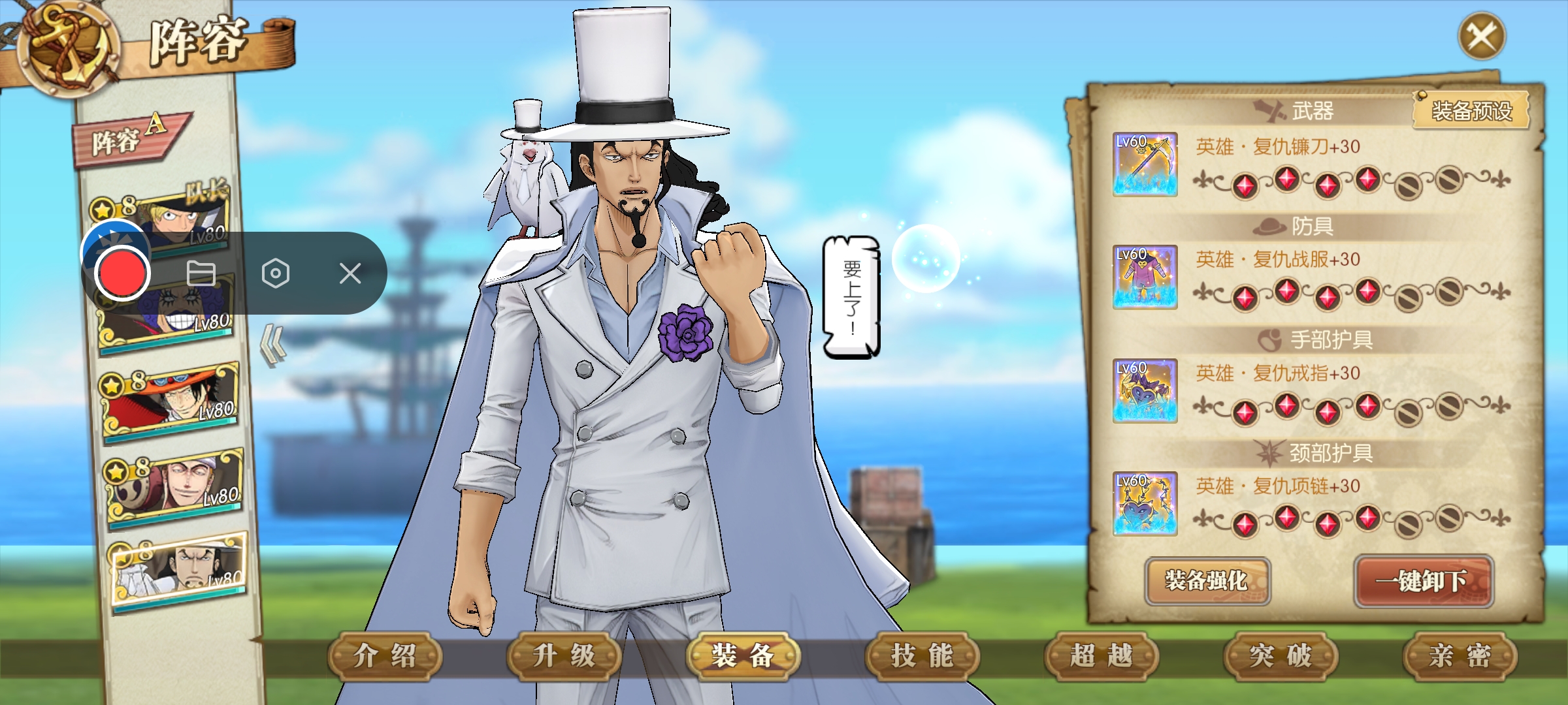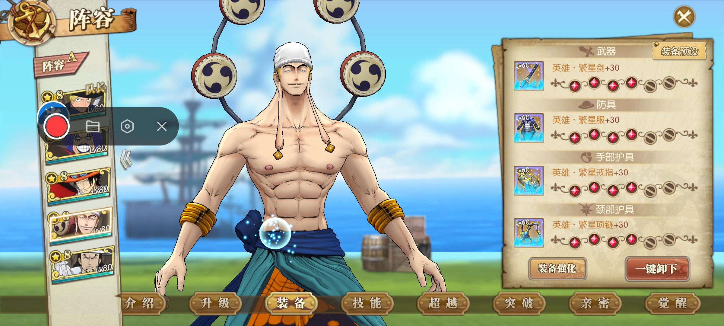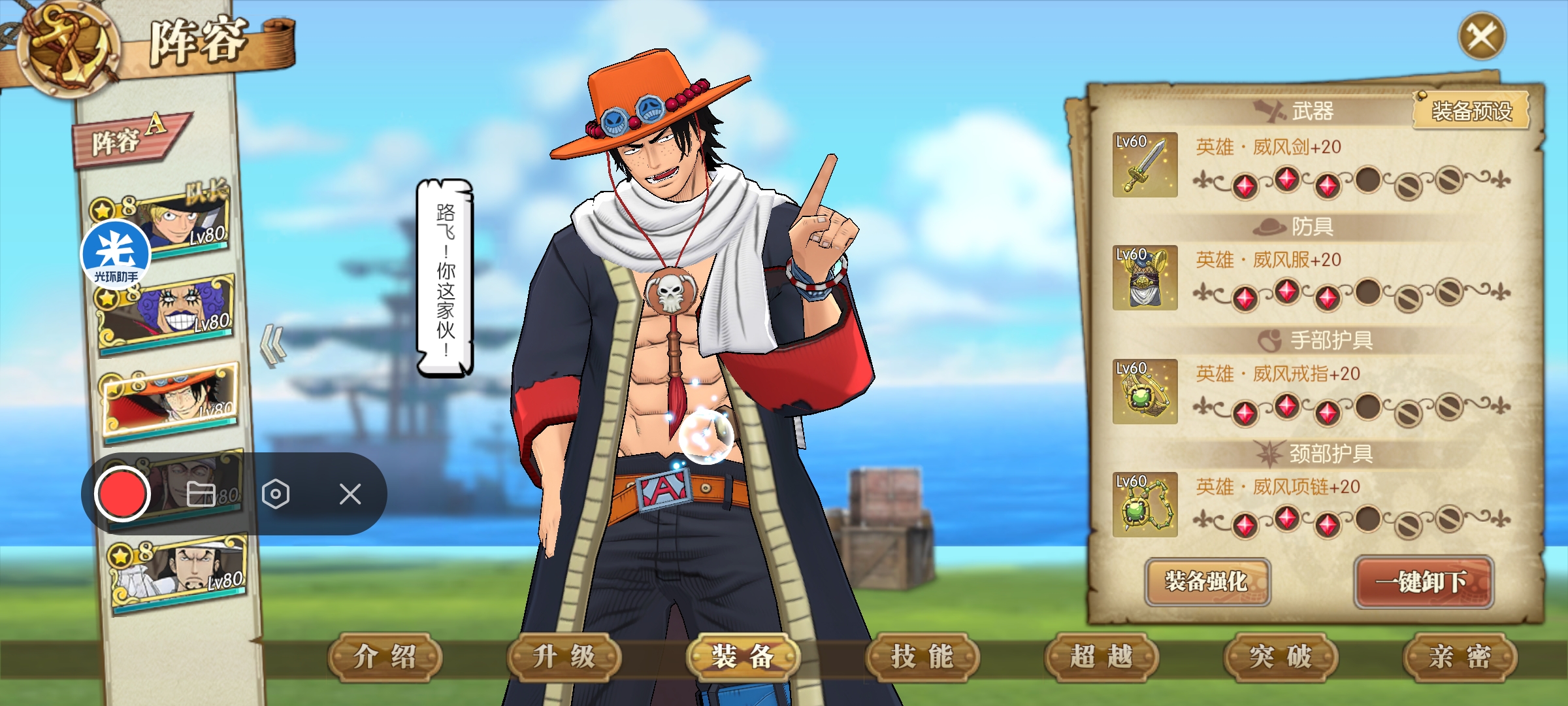 打法:萨博一速,也是这套阵容目前的核心输出。艾斯主打火伤,艾尼路辅助增强属伤,同时觉醒雷神本身的伤害也很高,我这里用的是觉醒一雷神。新世界豹子带两个主动加一个终结和奥义,主动带一个使终结眩晕的技能。人妖王辅助回血,同时给萨博加buff。阵容思路:艾斯和萨博主打火伤,艾斯和人妖王都可以给萨博增伤,艾尼路全员增伤,新世界豹子主打奥义和后期控制。如果第八回合没有完成击杀,只要麦哲伦或者小兵行动,直接就给我们团灭了,所以控制伤害很重要。如果伤害不够,建议带两个控制。