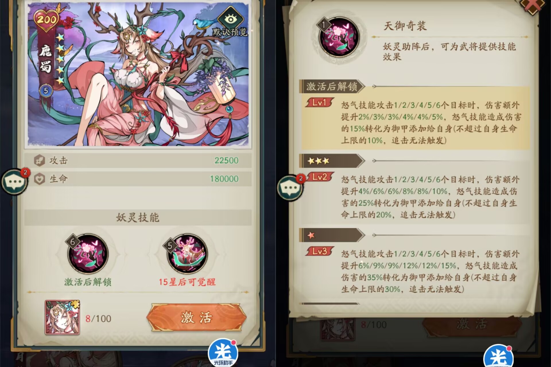 ③【鹿蜀】其实表现还不错,适合对单武将带也适合对群武将带,主要提升的是怒气伤害和伤害转换为御甲,属于攻守兼备的妖灵,有条件的大佬可以氪,这个版本也就只适合大佬氪了。