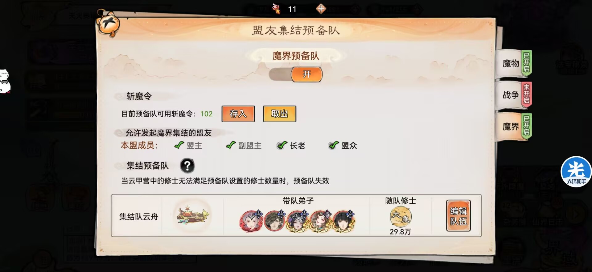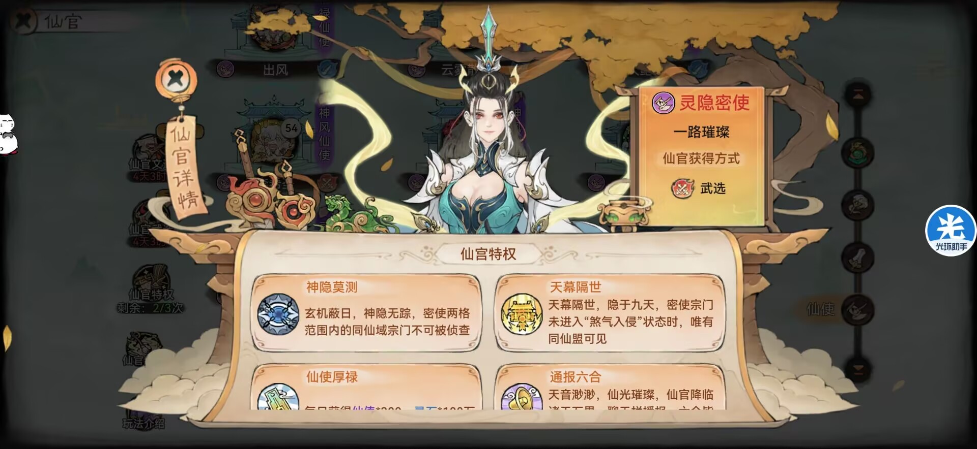 这时候就可以用仙盟中【仙官:灵隐密使】的能力来隐藏宗门,这让就算跑到敌人的中间也发现不了我们,我们可以通过靠这个仙官来打魔君从而不会被仇家发现。
