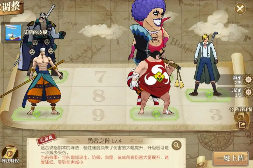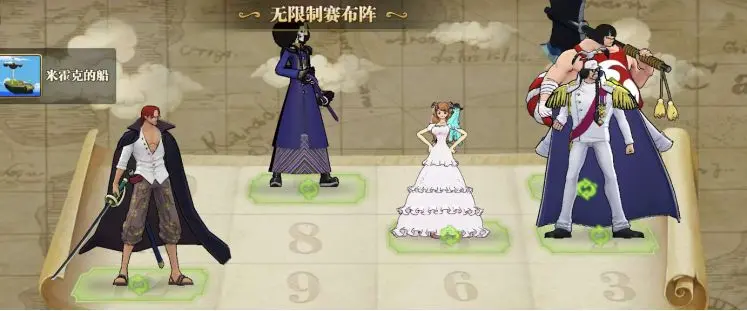 这套是最常见的海军搭配了,黄猿复仇或者游侠,藤虎红骨,塔希米繁星,烟鬼散韧或者散格挡,战桃丸卫兵,开局战桃丸会给黄猿护航调度,加上烟鬼给黄猿的增益,藤虎一速启动以后,黄猿可以无压力输出一整套技能(不用关技能被动),遇到脆皮队伍就是直接启动了,遇到现在最热门的肉队可能会比较尴尬,突破不了后排会被肉队慢慢磨死。整体强度是在线的,而且玩起来全是爽局,输赢都在一瞬间结束战斗。
