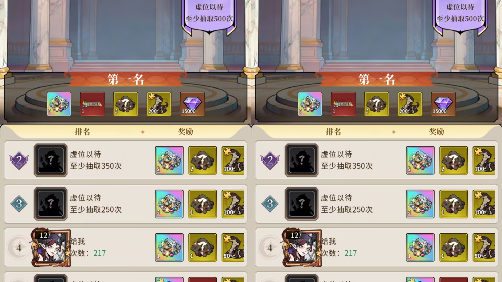 因为第一名奖励很丰厚:3个奇珍自选+称号+钻石等奖励。所以囤500抽是基础。