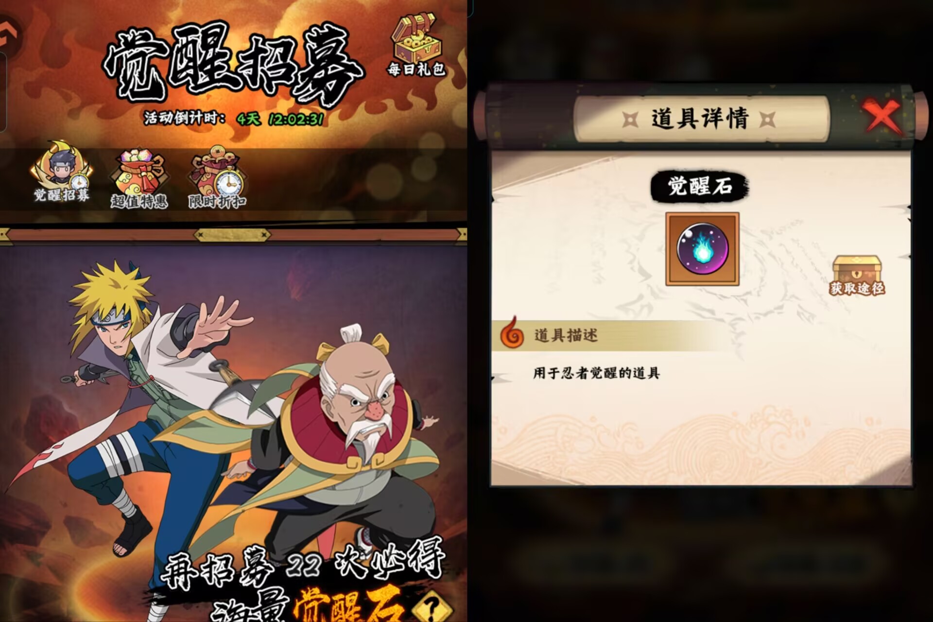 觉醒思路:由于现在觉醒只开放了【四代火影】和【大野木】这两个忍者,不是主玩这两个忍者的玩家可以先不觉醒,觉醒石是通用的,可以把觉醒石囤起来留给自己的主力阵容的忍者。