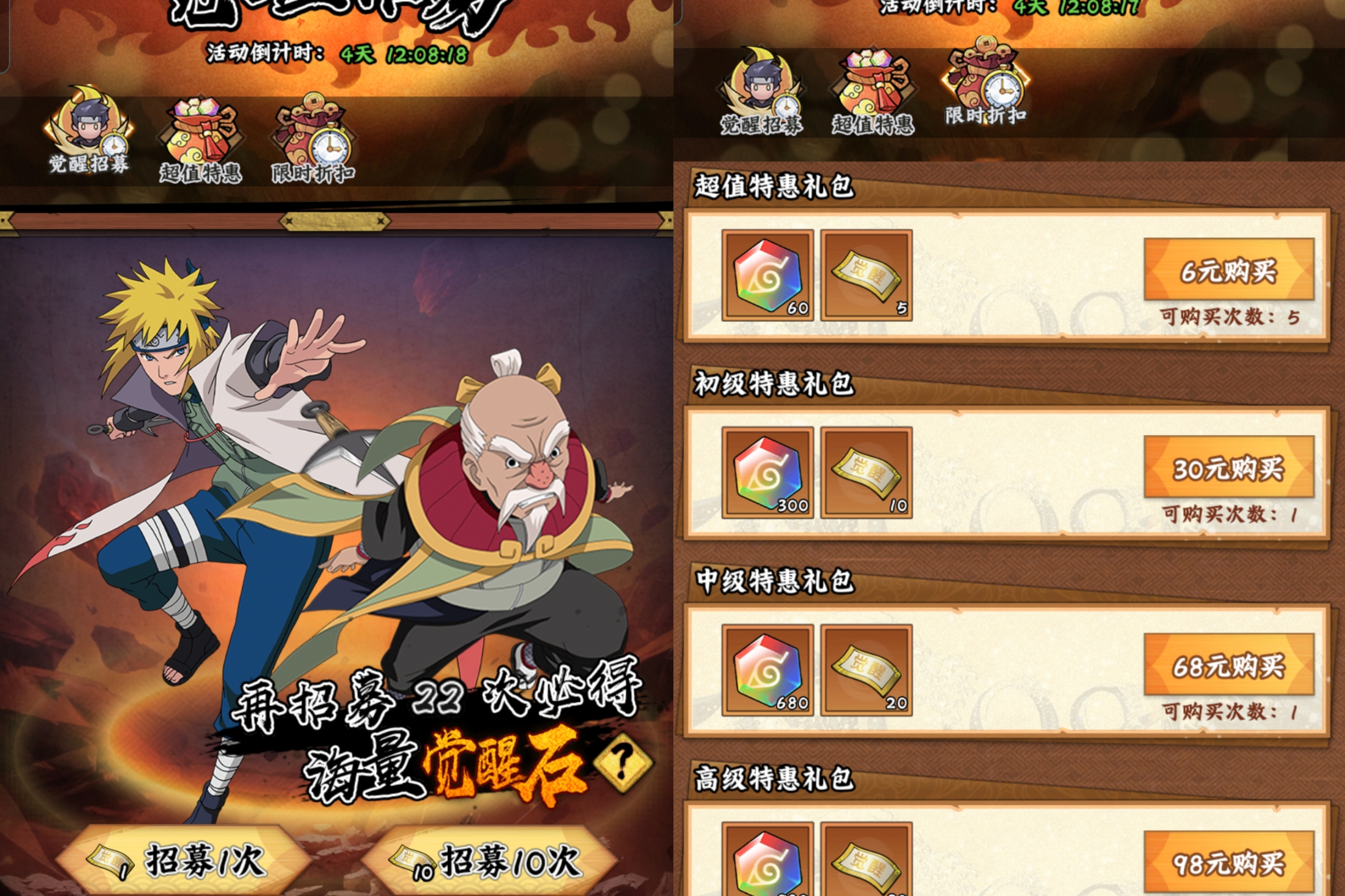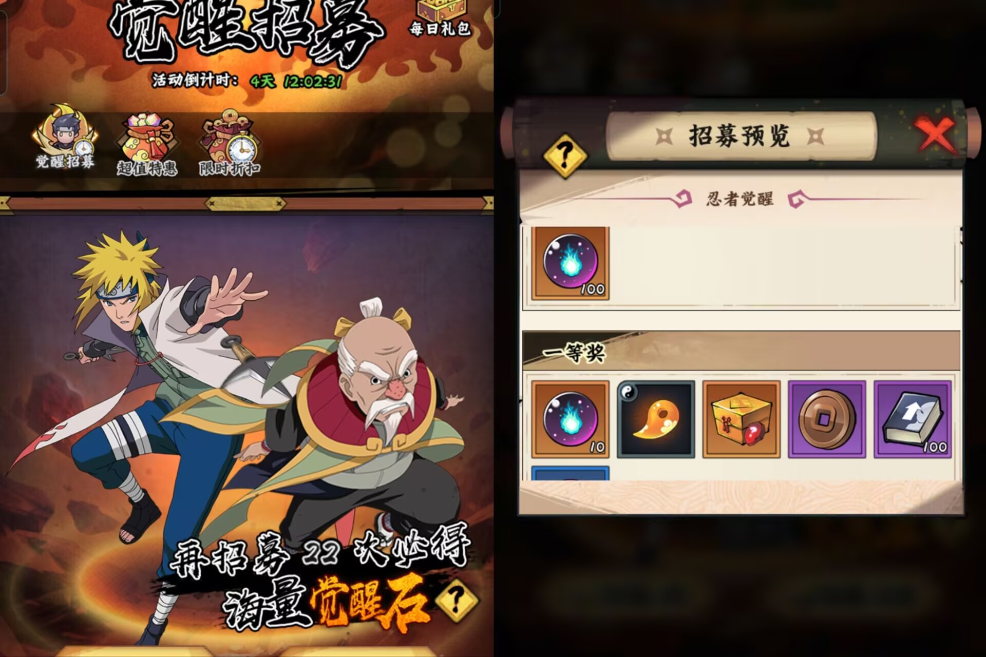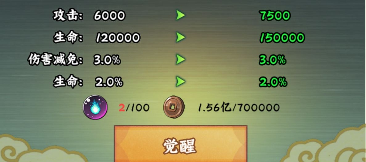 主要觉醒后就是提升角色的:攻击、生命、伤害减免、生命等属性。我们可以通过这个活动抽取【觉醒石】用来觉醒忍者从而加强忍者的属性和战斗力。