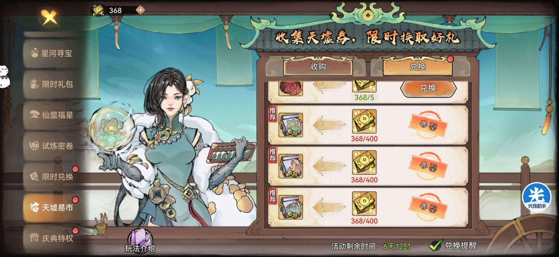 三:【天墟易市】(活动的大福利)。这个玩法还不错,也是本次活动的核心福利了