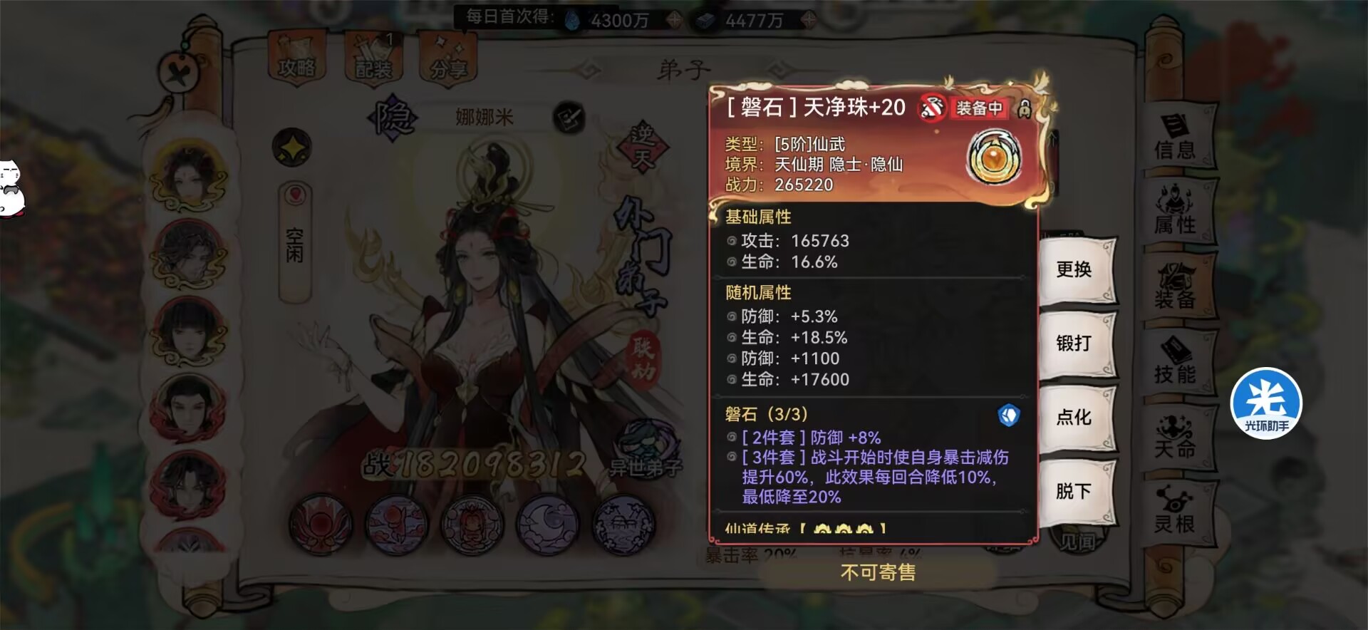 同时最好是给有无敌和不败锁血的弟子带,没有无敌和不败的弟子最好带金刚套或者是盘石套。比如南宫婉这种没有无敌不败的弟子。