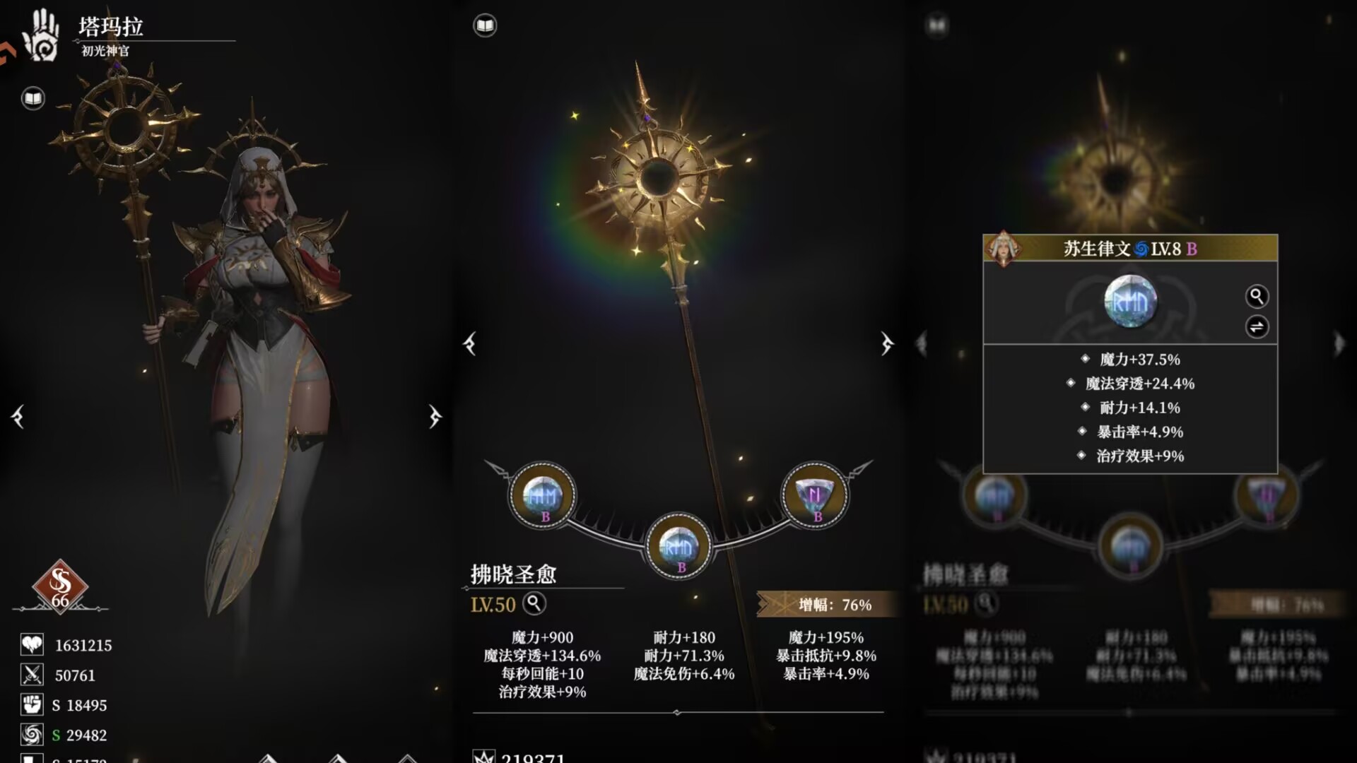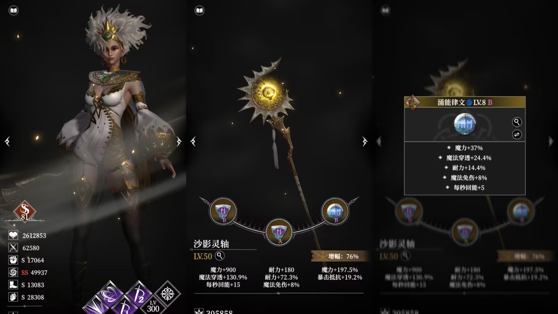 这套律文的优点就是:加快回能,同时三个都有魔法免伤提升,同时全方面加强魔力、穿透、耐力等属性,全方面加强织沙者。