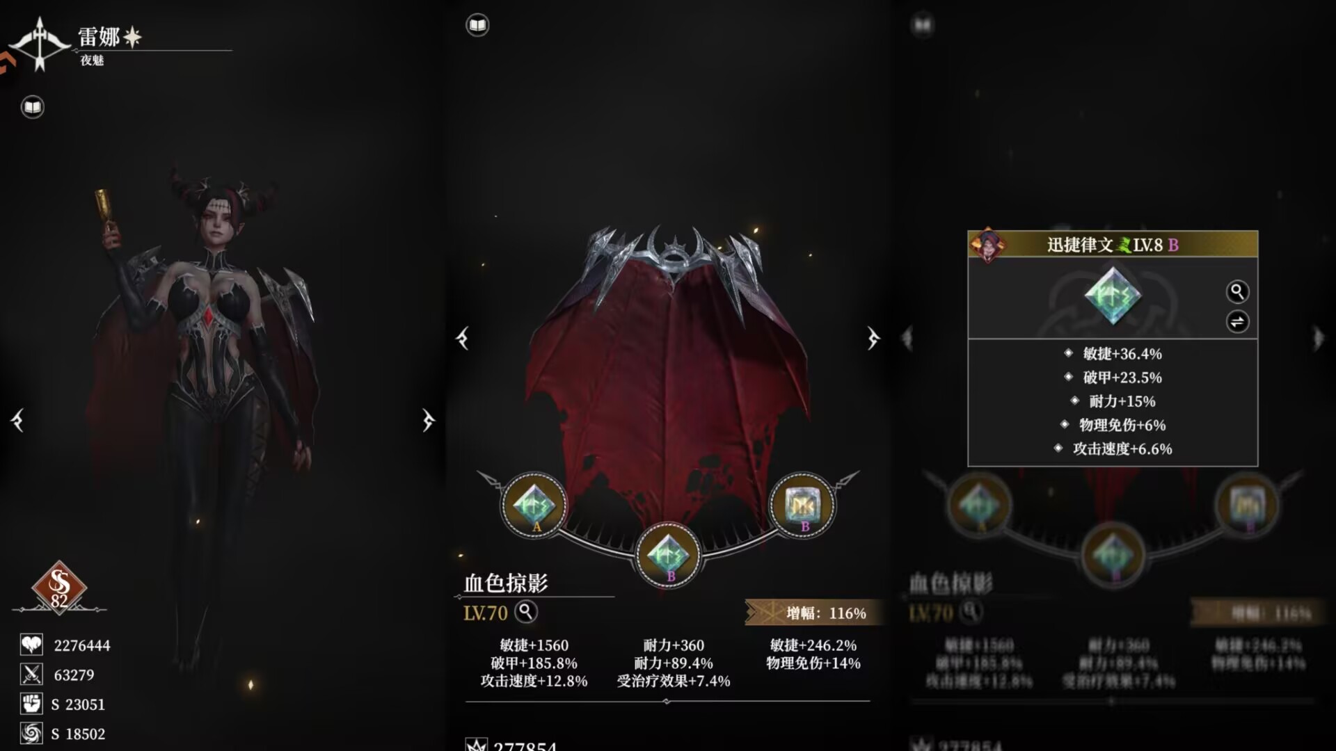 迅捷律文+神勇律文+迅捷律文这三个律文都可以提升敏捷、破甲、耐力,都是夜魅非常刚需的属性。