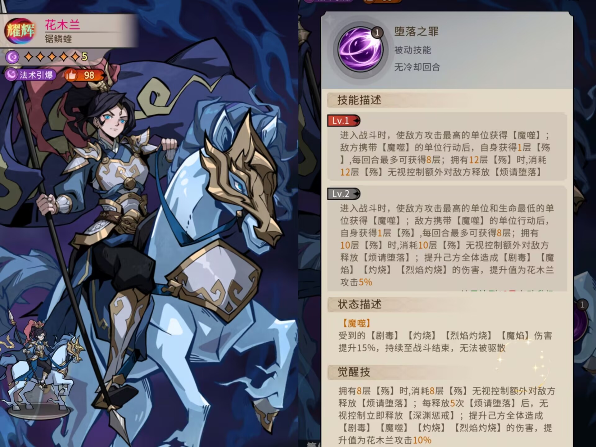 ②带有【魔噬】敌人行动后花木兰可以获得1层殇,每回合殇最多可以获得8层。