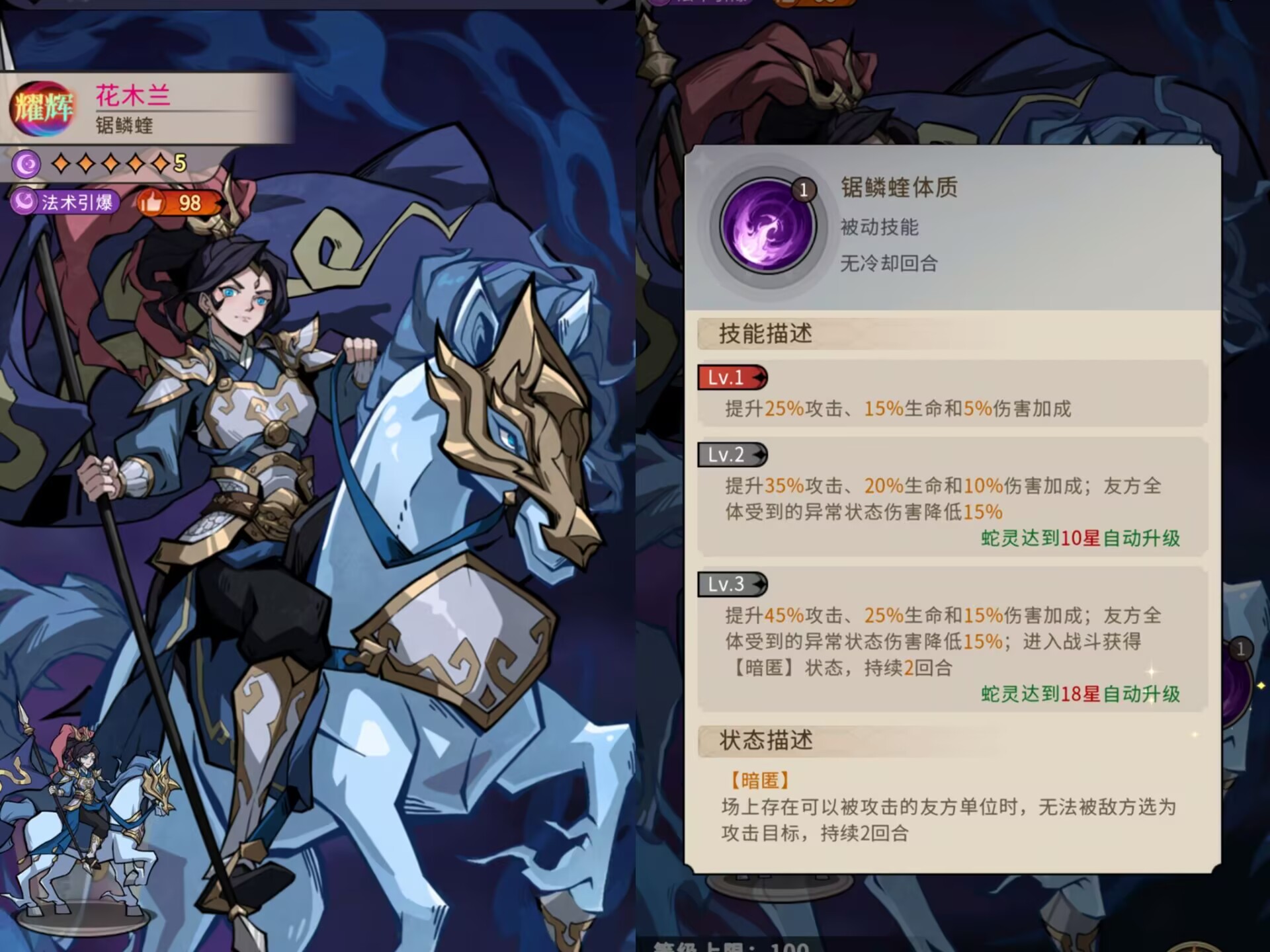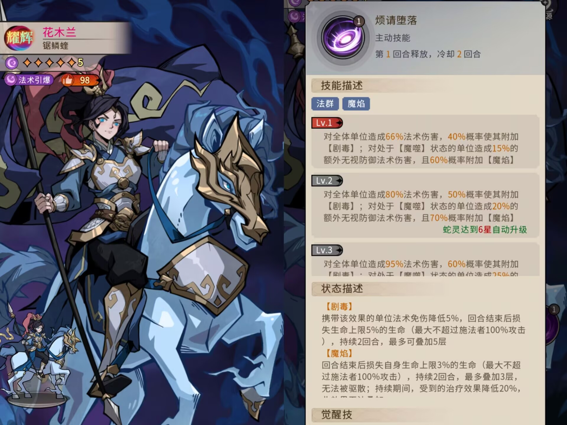 ①花木兰的必杀技可以优先让1个目标进入【魔噬】状态,然后对敌方全体造成140%倍率的法术伤害。