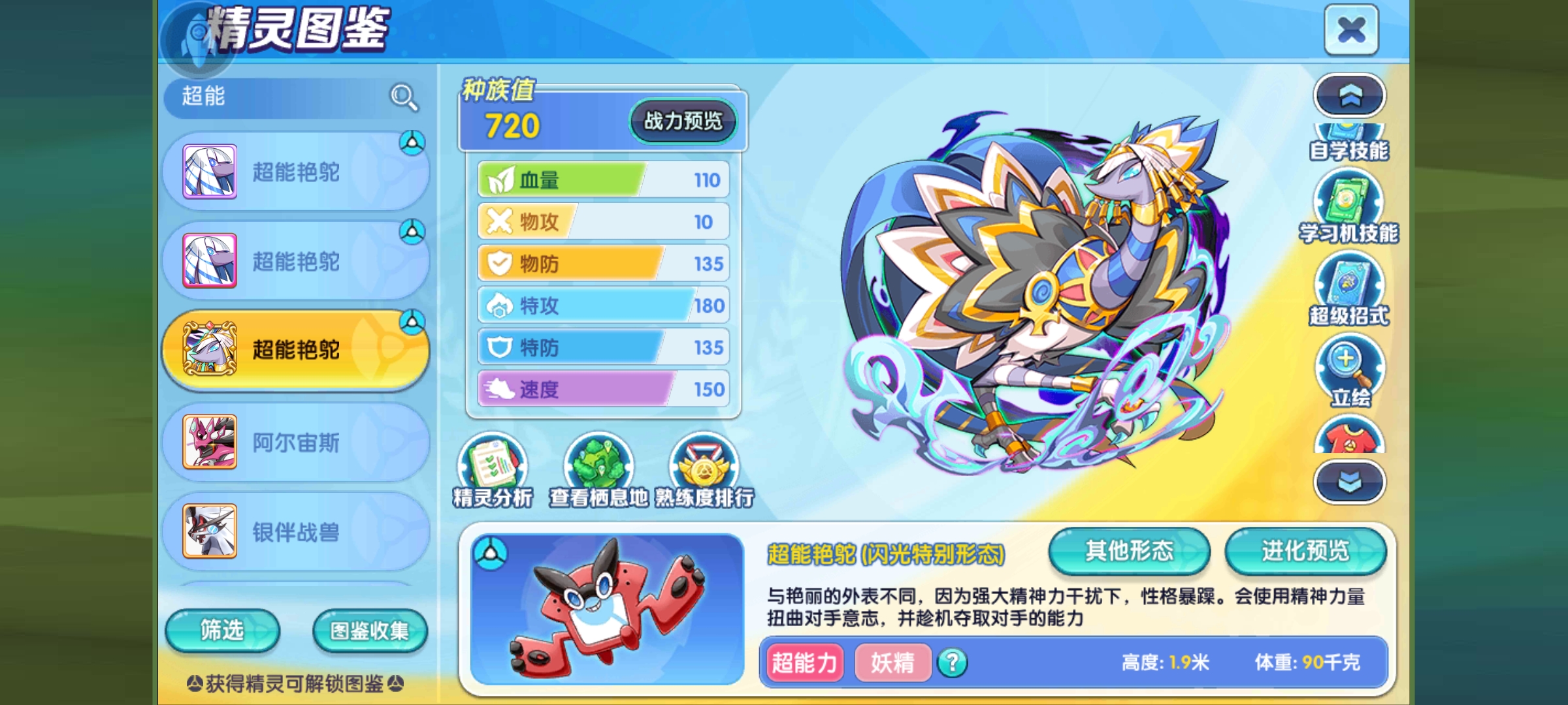 首先来看一下超能艳驼的种族,有效种族都是比较不错的,首先血量是110,特防和物防都是135,相比其他平民防强化家族的宠物来说,超能艳驼还是不怎么肉的,然后还有180的特攻,配合特性,输出能力还是相当恐怖的了,速度种族只有150,看似比较鸡肋,快不过高速宠慢不过骗术宠,但是它的独特玩法是用偷对方buff,速度也是,那样即便速度种族只有155,也依然有机会进行先手输出。