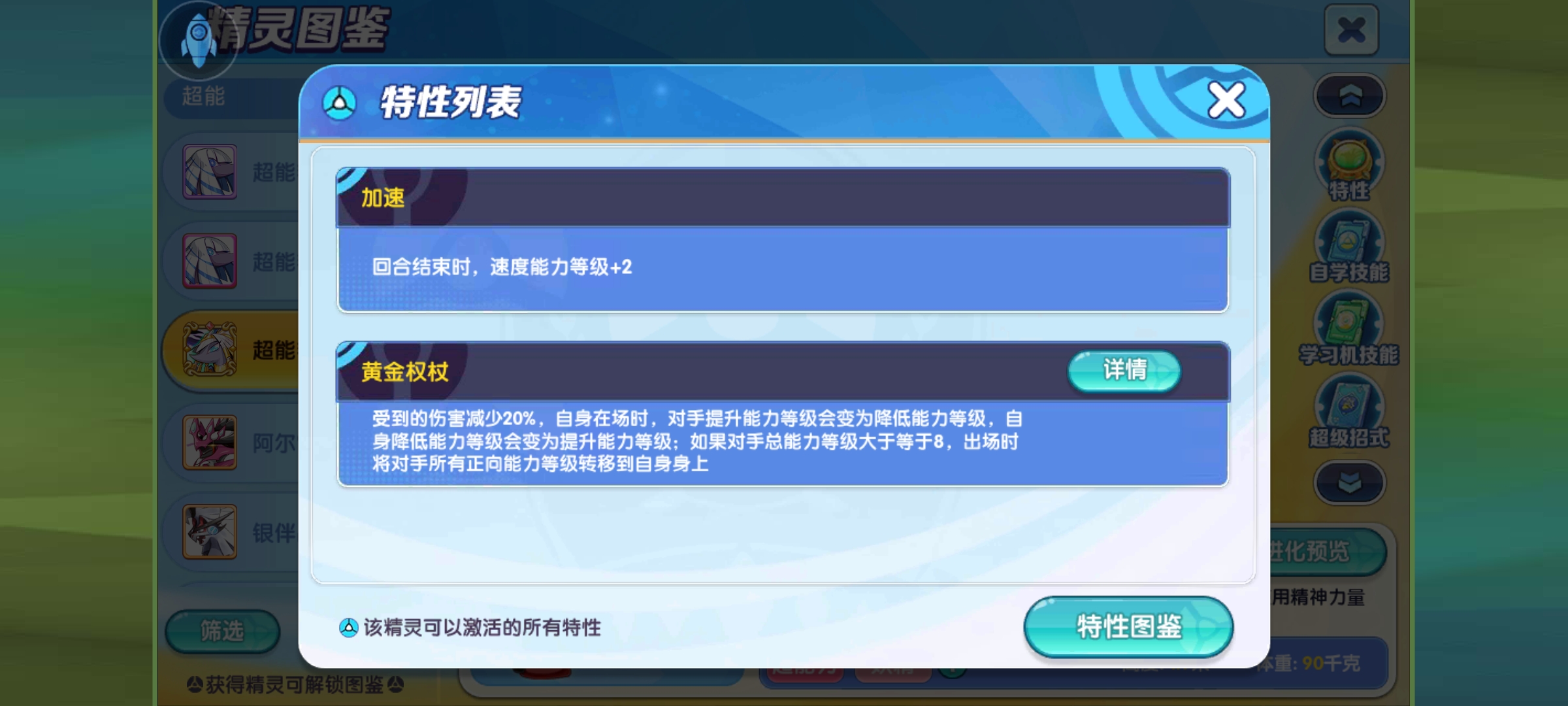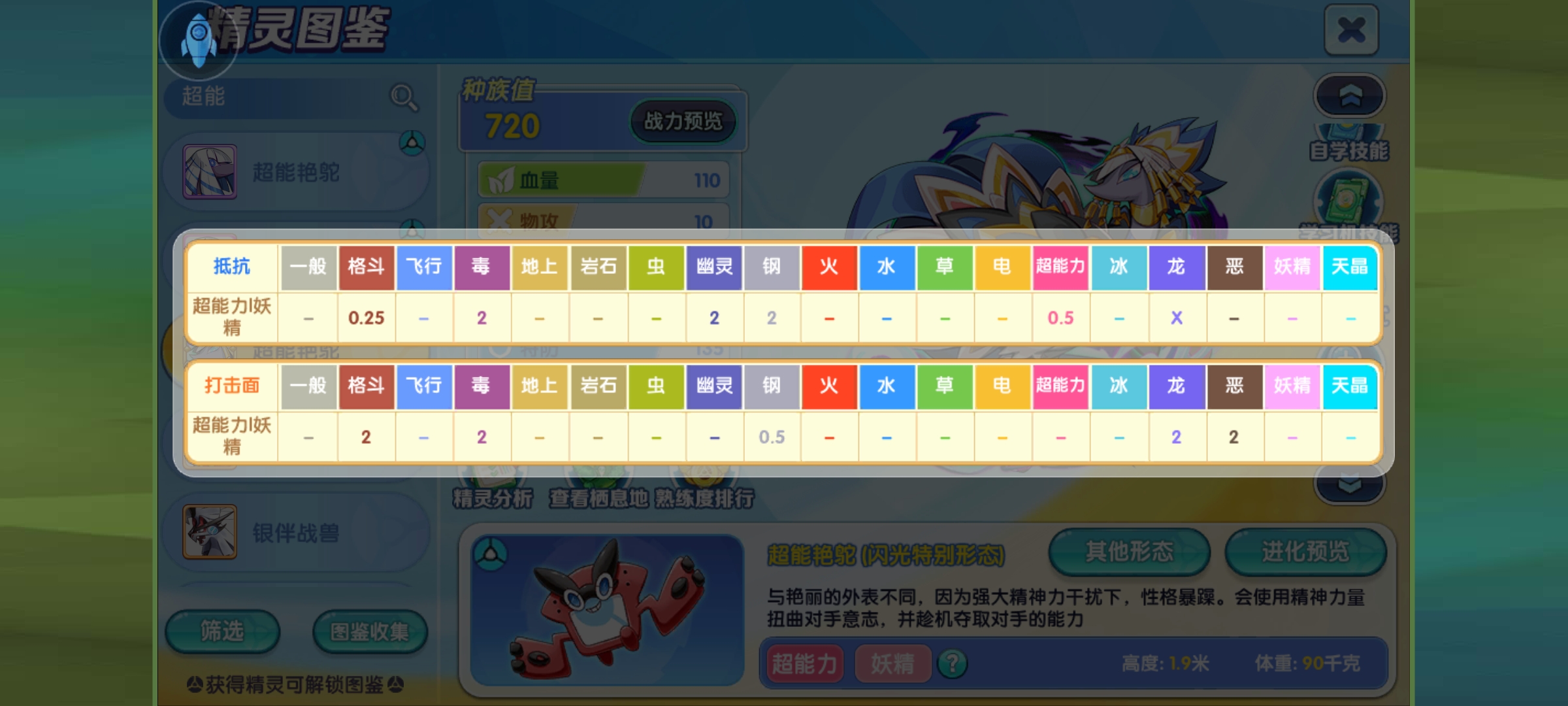 它是超能和妖精属性,超能属性,在这个游戏里面抗性是比较弱的,但是妖精属性还可以,能够免疫龙系招式,并且抵抗格斗、超能力,这些都是比较热门的属性招式,但是被毒、幽灵、钢属性克制,其中钢属性技能比较多,在战斗中需要留意,当前版本又有很多宠物可以抵抗超能和妖精属性,最明显的就是巨金怪了,只要遇到巨金怪自身就完全没有任何的输出空间,但是可以偷对方buff,也有机会突破,所以说这个属性的话,只能说属于一般般不强也不弱。