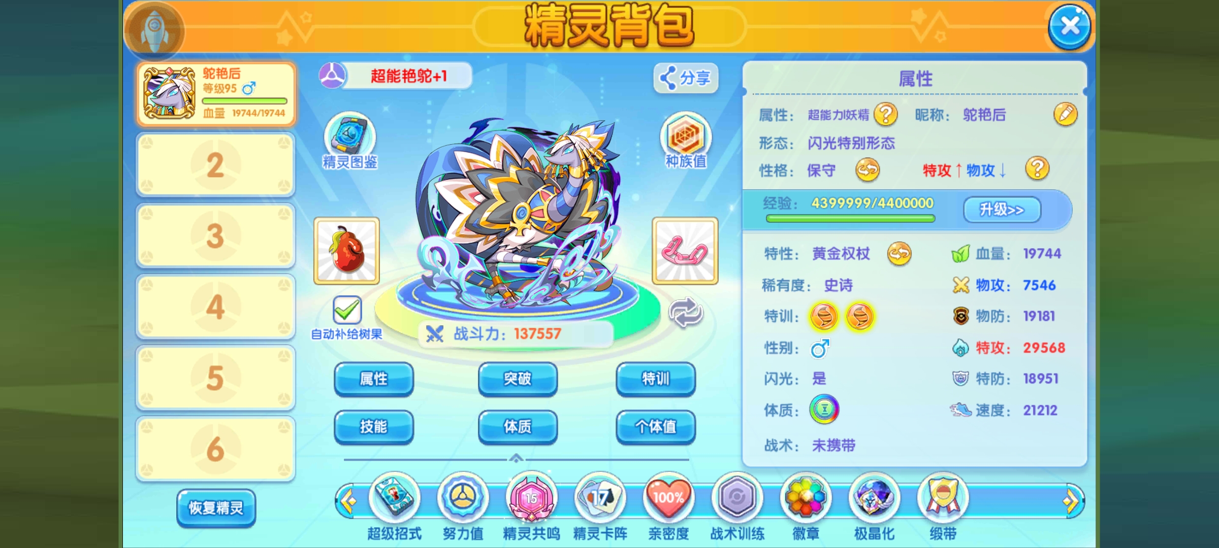 总结说明:超能艳驼能学的技能还是比较丰富的,像常规的强化宠物都可以处理,目前的巨金、大王之类。以及回复技能也有歇息这种,不过也是经过实战,个人感觉它的强度没有月月熊出现那样惊艳,因为使用机会比较少,而且超能艳驼虽然肉度还可以但也不像钢柱子那样是坦克级别输出选手,在战斗中也比较吃队友配合,有了合适的队友去配合,超能艳驼可以有更好的发挥。