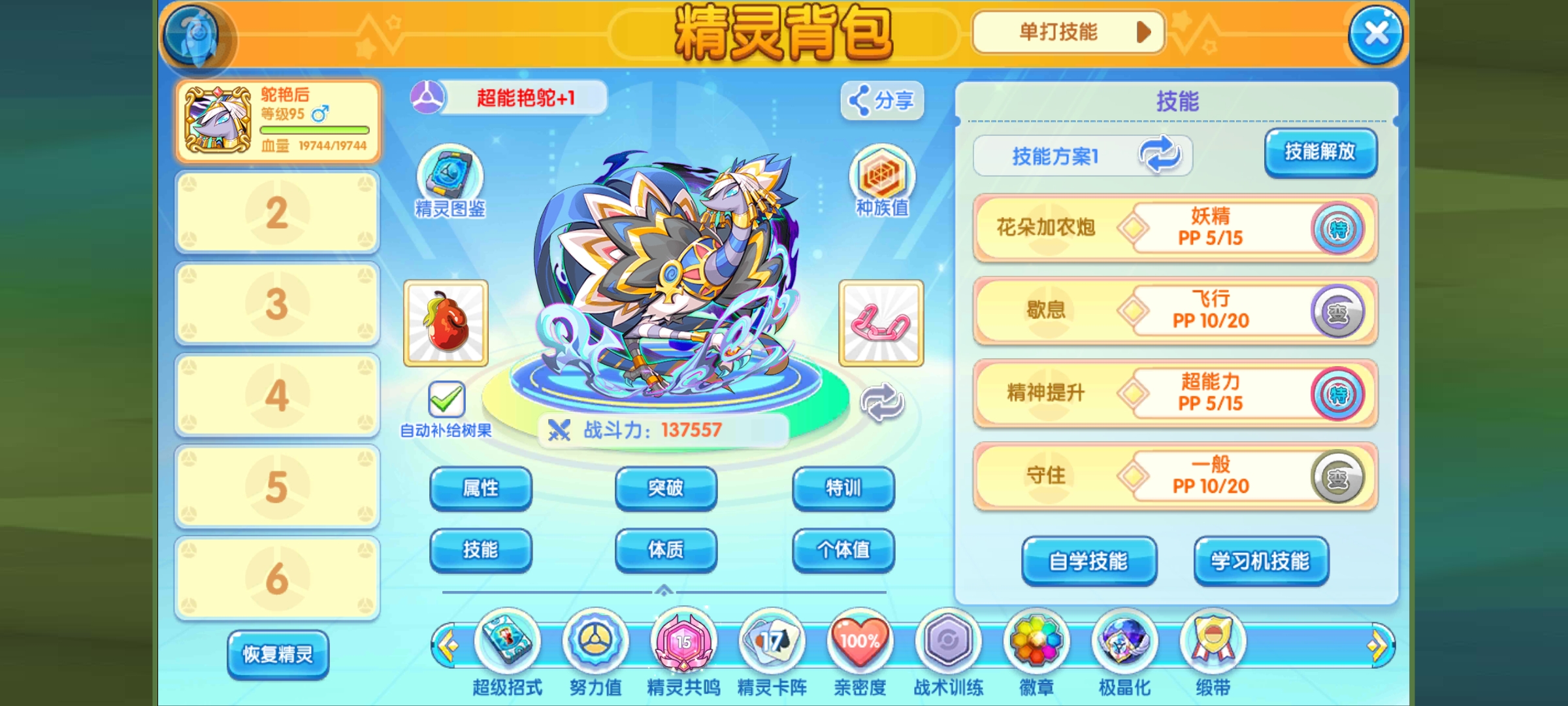 超能艳驼的特攻随还是非常高的,特性和钛金加成后,输出也就可以看了,这里辅助技能就是常规的玩法了,而大家都知道它的特性偷强化,因为有些低等级或者新入坑的玩家一下子没法获得强力强化宠,反而比较高端的局多,发姐、熊猫之类。输出的技能里面,本系的花朵是必带的,这个白嫖就可以弄到,超能本一些消费箱子就可以弄到,所以说平民也可以玩,而像之前介绍的,钛金化输出也可以用飞行系技能,超能系也可以用精神吸收代替,输出的同时补血也是不错的选择。
