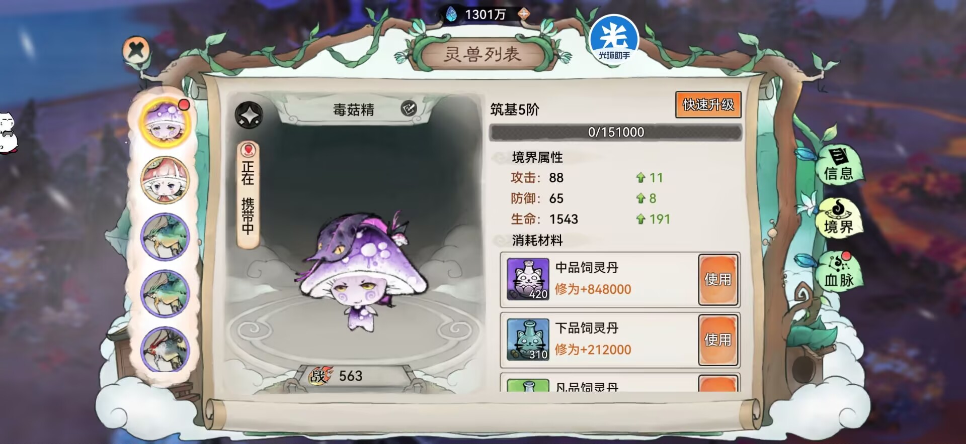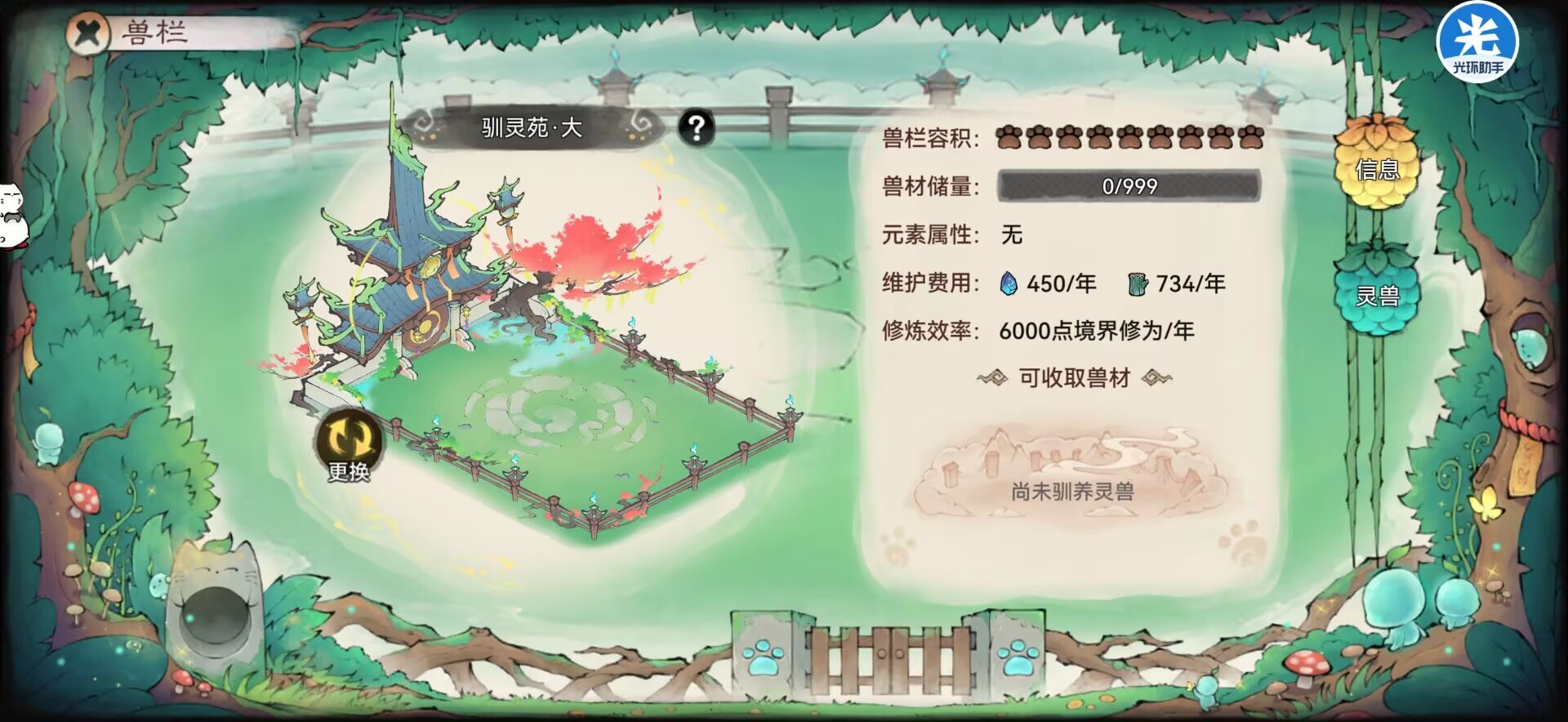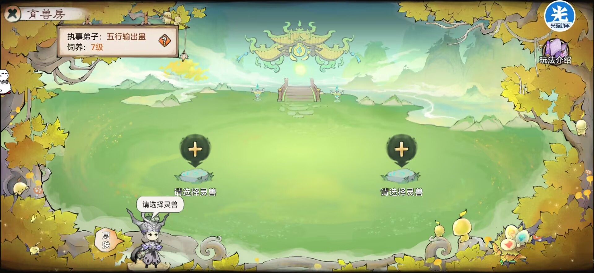 这就里就是提升灵宠经验的地方,同时还可以产出兽材和让灵宠的心情提升。