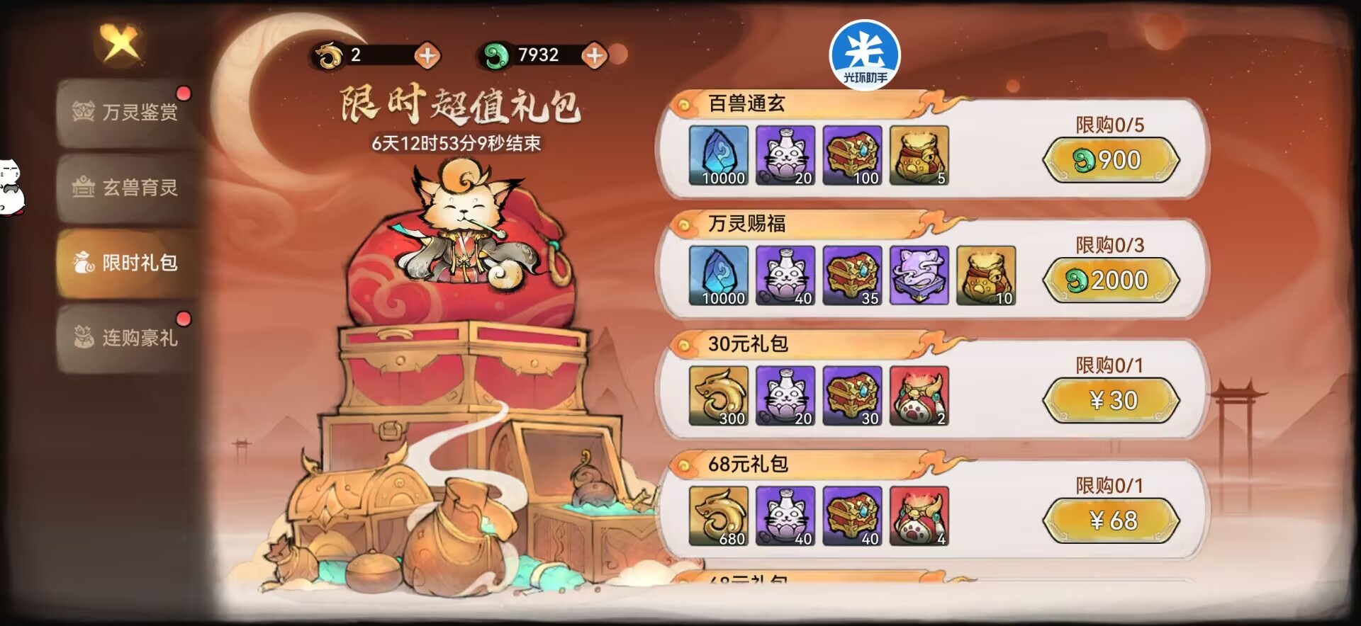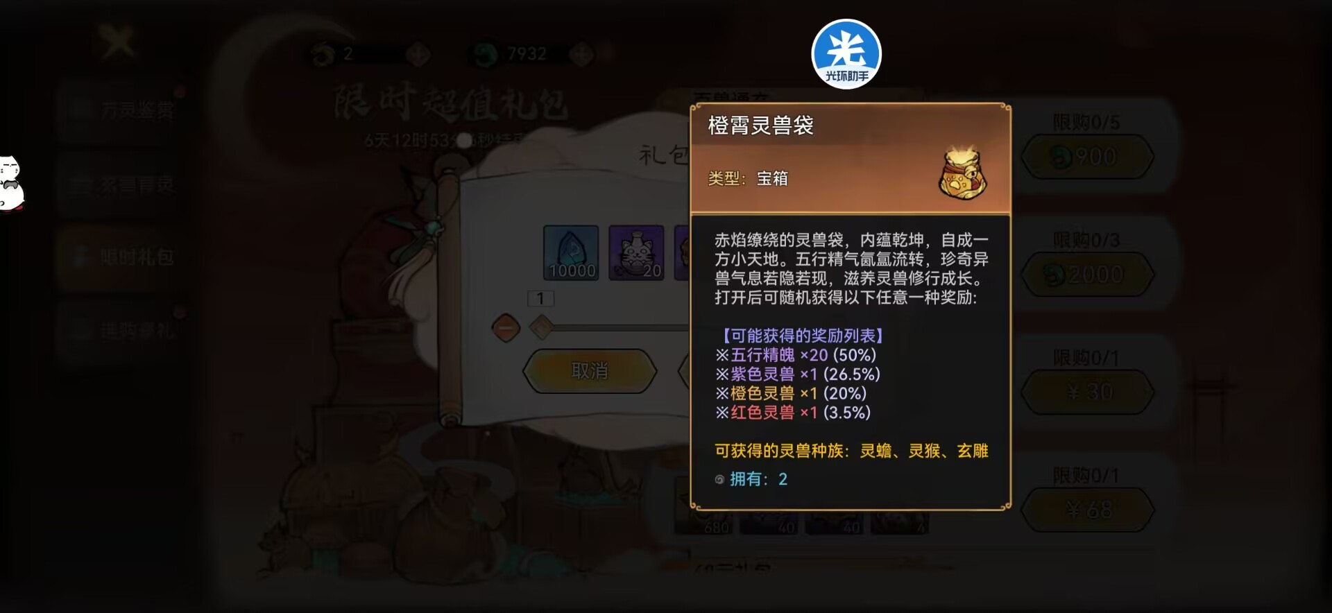 比如:首次开启灵宠玩法的时候【万兽鉴赏】里面的灵玉礼包和氪金礼包都可以获得灵兽袋。