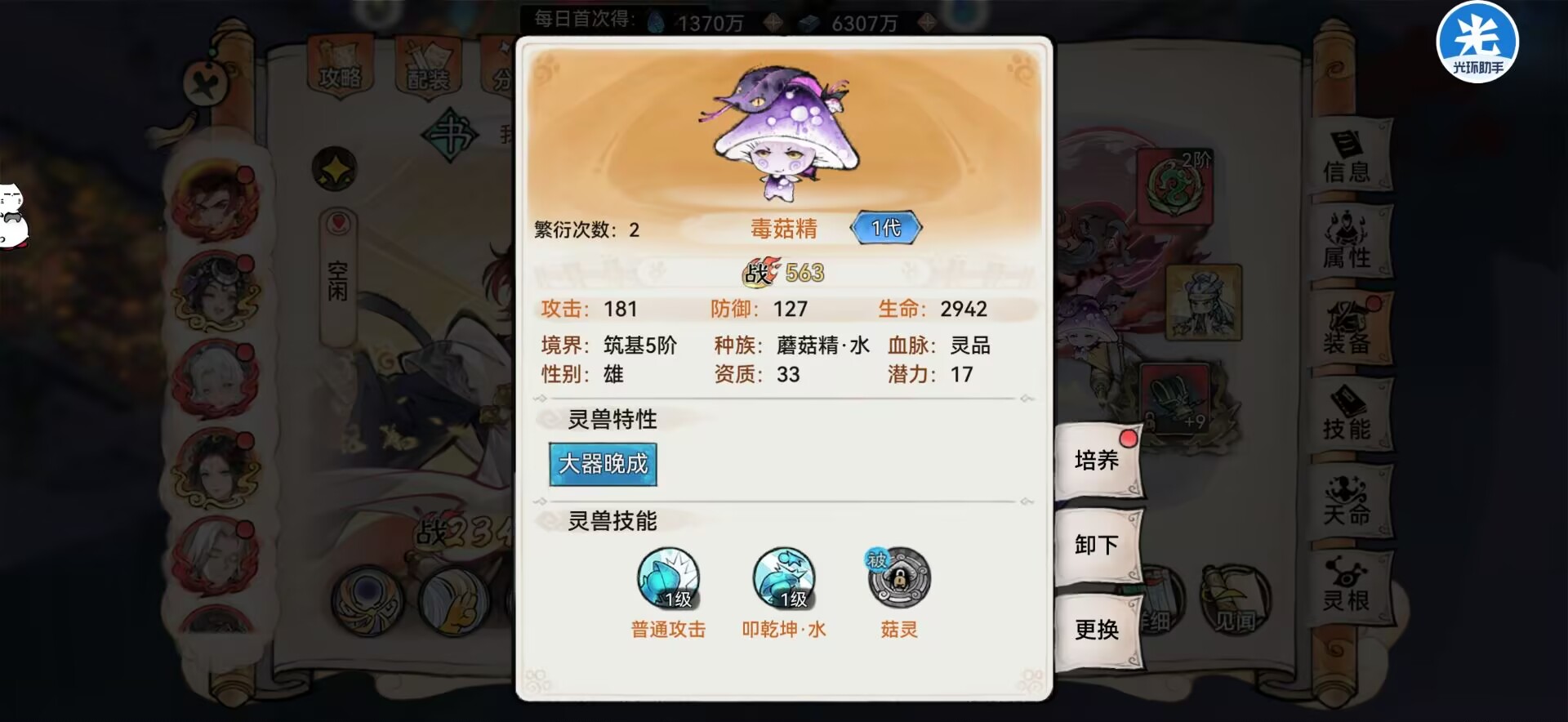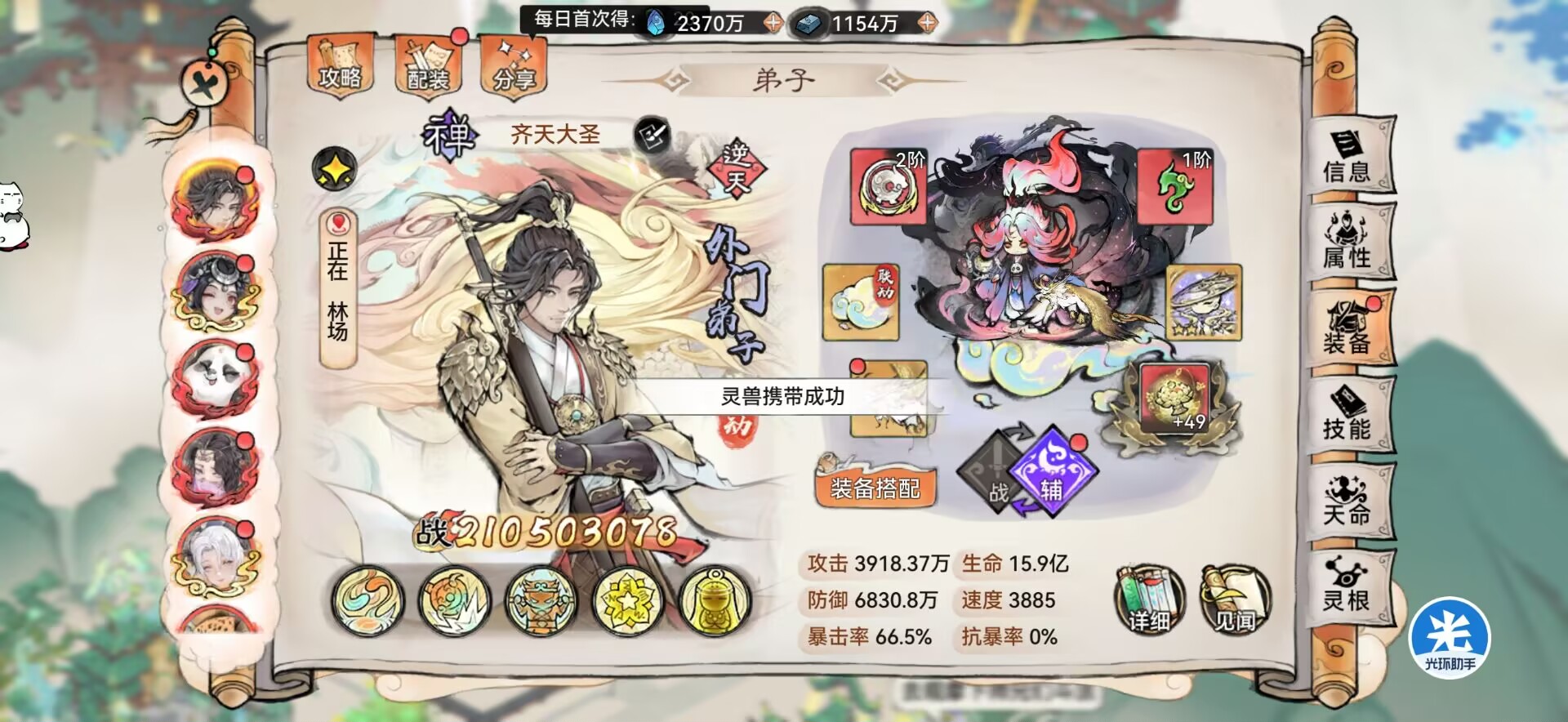 ①我们抓取的灵宠可以装配在弟子身上。