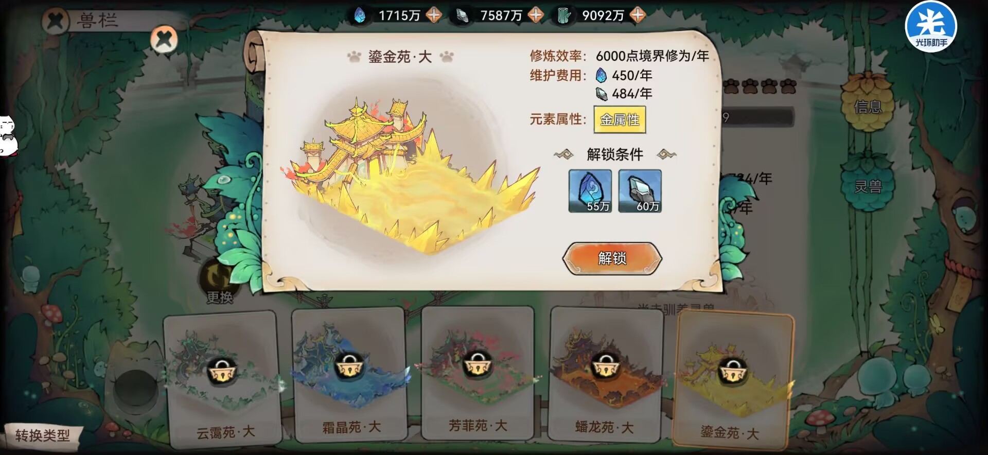 所以大家在放置灵宠的时候一定要按属性区分开来,金属性就放在【金训灵苑】里面这样获得的经验和资源也更多。