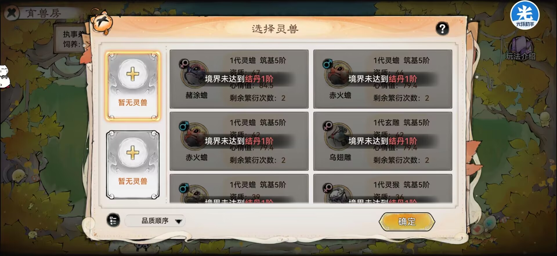 ②必须是同一个品种,不同品质的灵宠无法繁衍,比如猴子和雕不能繁衍,必须是猴子和猴子。