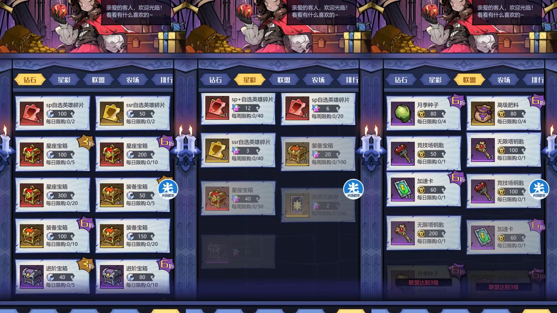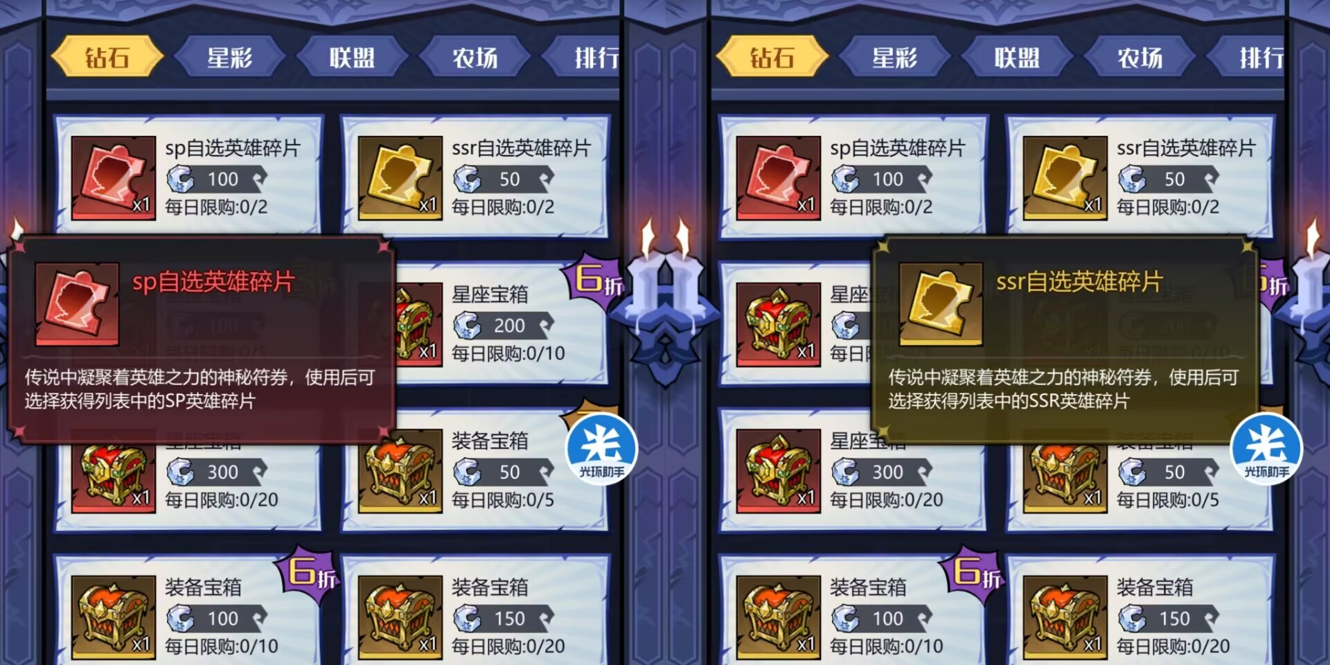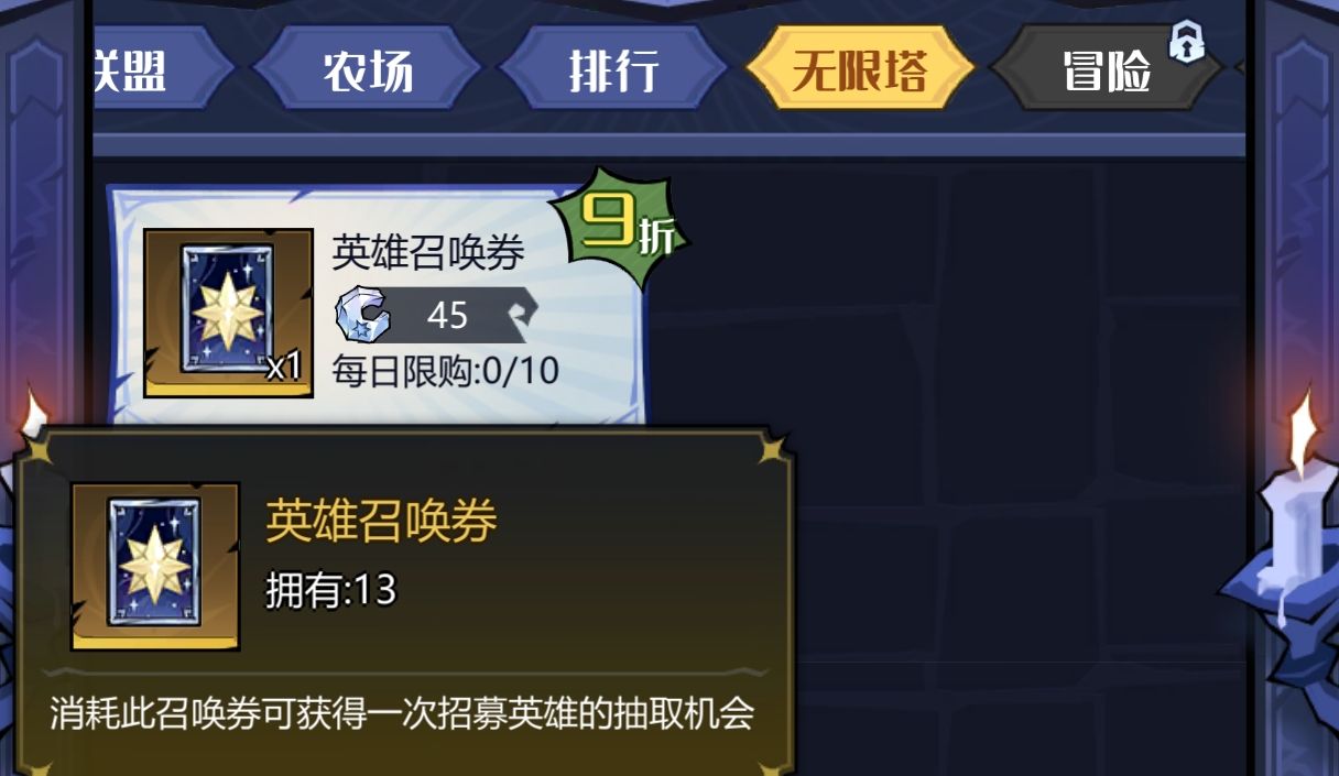 这里目前只有一个物品兑换就是英雄招募卷,这个前招募卷9折也是必须兑换的,每天可以买满10张,比你之前抽卡划算,可以省50钻石。