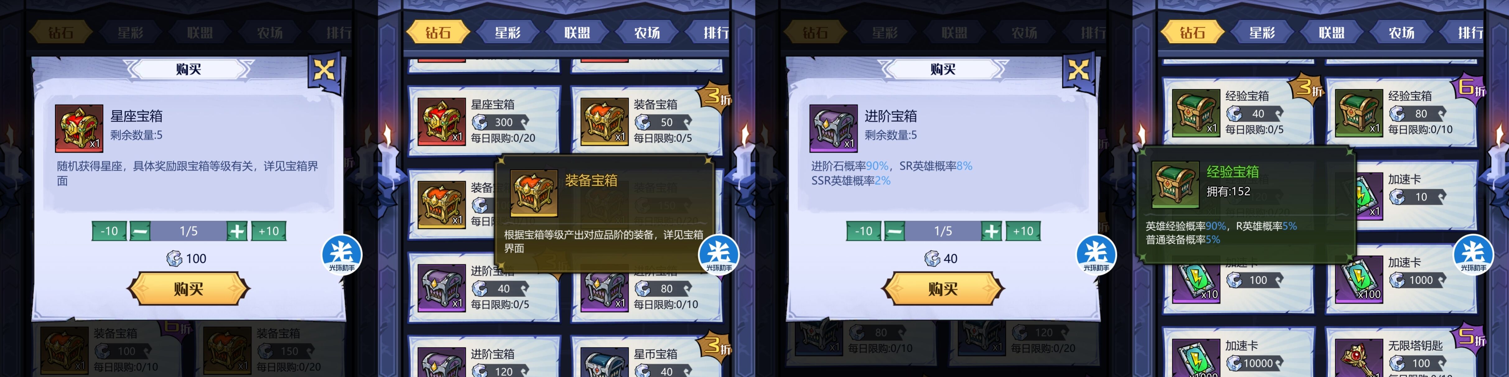 ②另外比较推荐买的就是:3折的星座宝箱、装备宝箱、进阶宝箱、星币宝箱、经验宝箱。