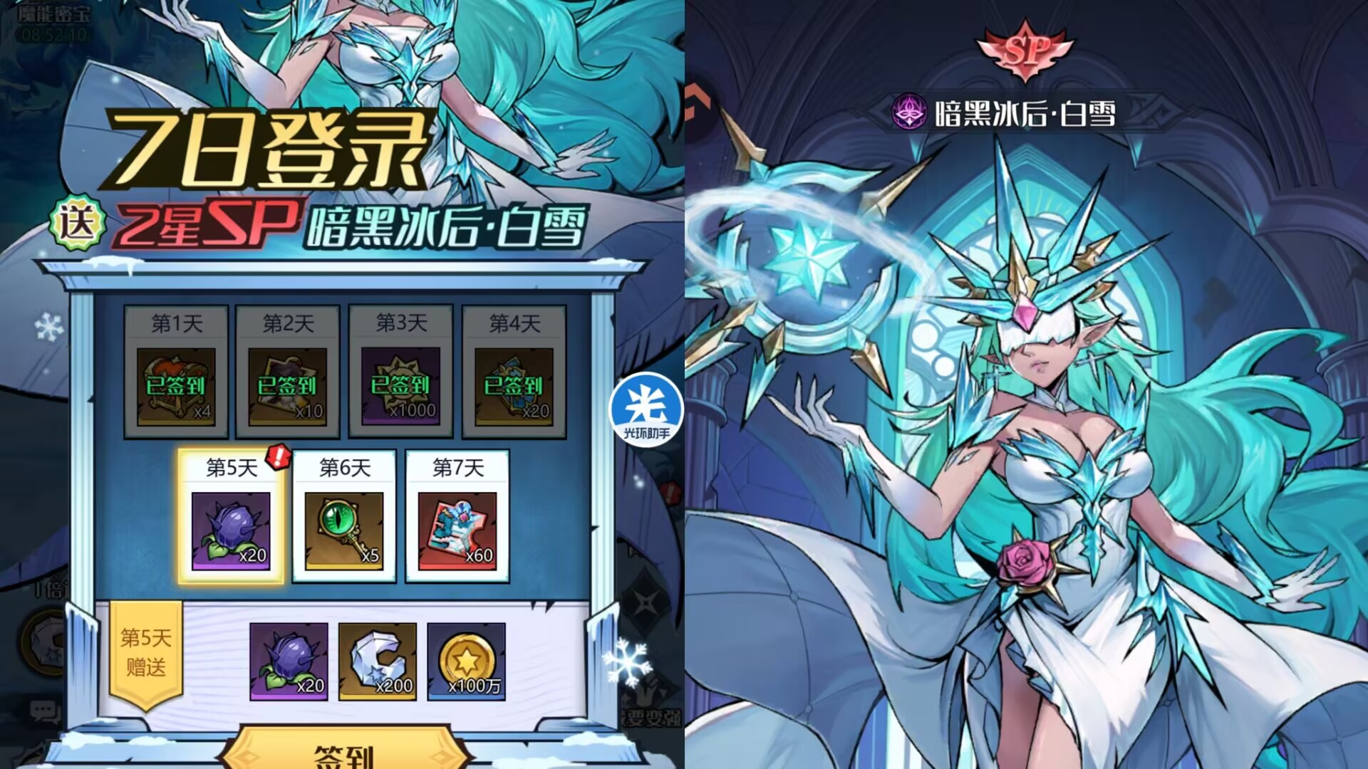 七天签到主要是可以获得:【sp白雪】这个角色对平民玩家来说可长期用,也比较容易升星抽卡容易出。是我们阵容的核心主力,有了以后平民直接上场即可。