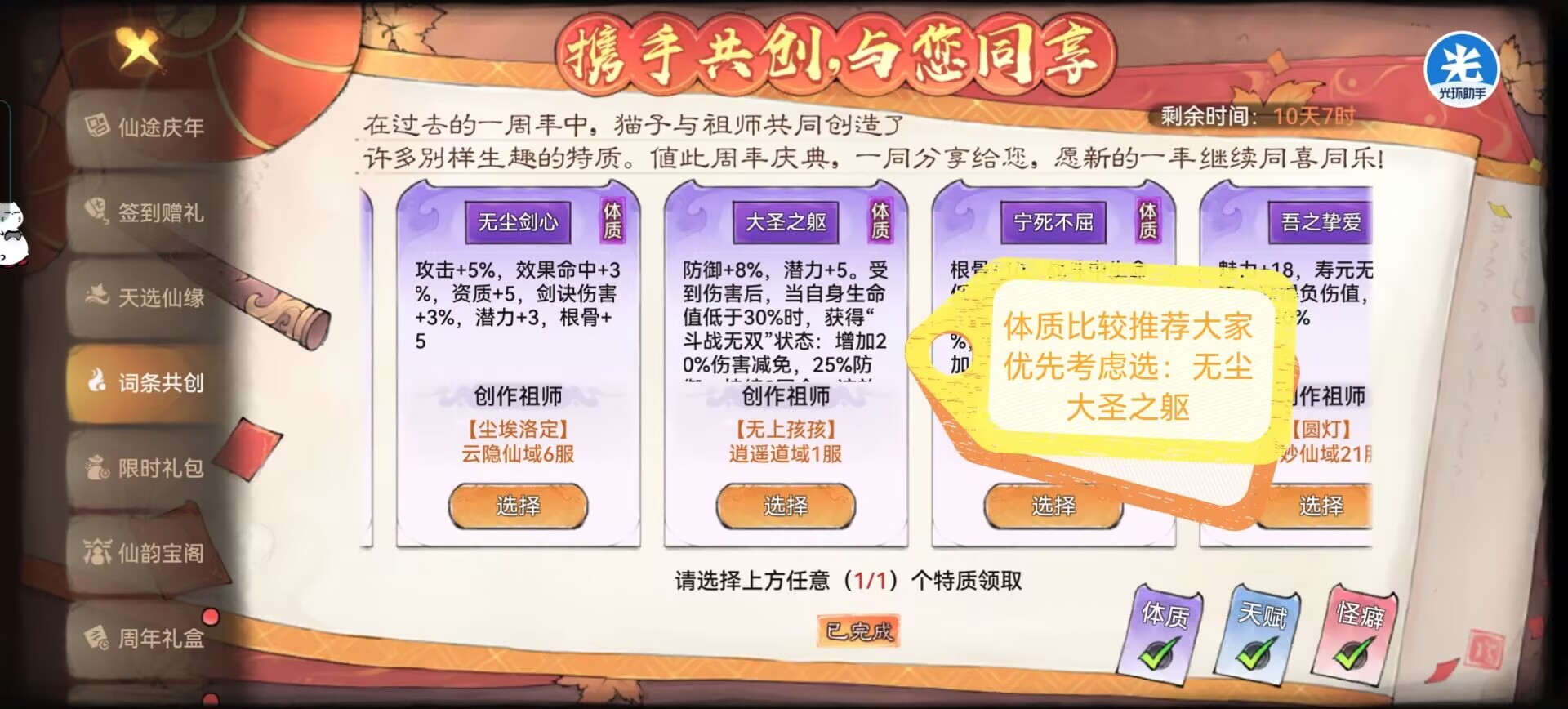 1:【体质】选择推荐。体质比较推荐大家优先考虑选择的就是:无尘剑心和大圣之躯。