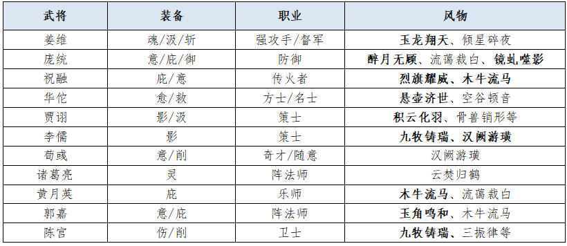 庞统得益于同样蜀谋双阵营,更容易与姜维配合组成二级阵营羁绊,同时,搭配祝融、诸葛亮、黄月英都有非常好的效果,灵活多变,亦可以有效应对前期的兵械库谋副本。