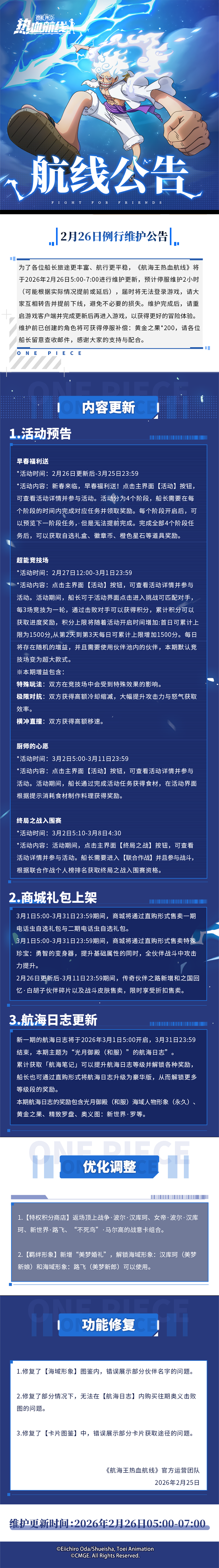 为了各位船长旅途更丰富、航行更平稳,《航海王热血航线》将于2026年2月26日5:00-7:00进行维护更新,预计停服维护2小时(可能根据实际情况提前或延后),届时将无法登录游戏,请大家互相转告并提前下线,避免不必要的损失。