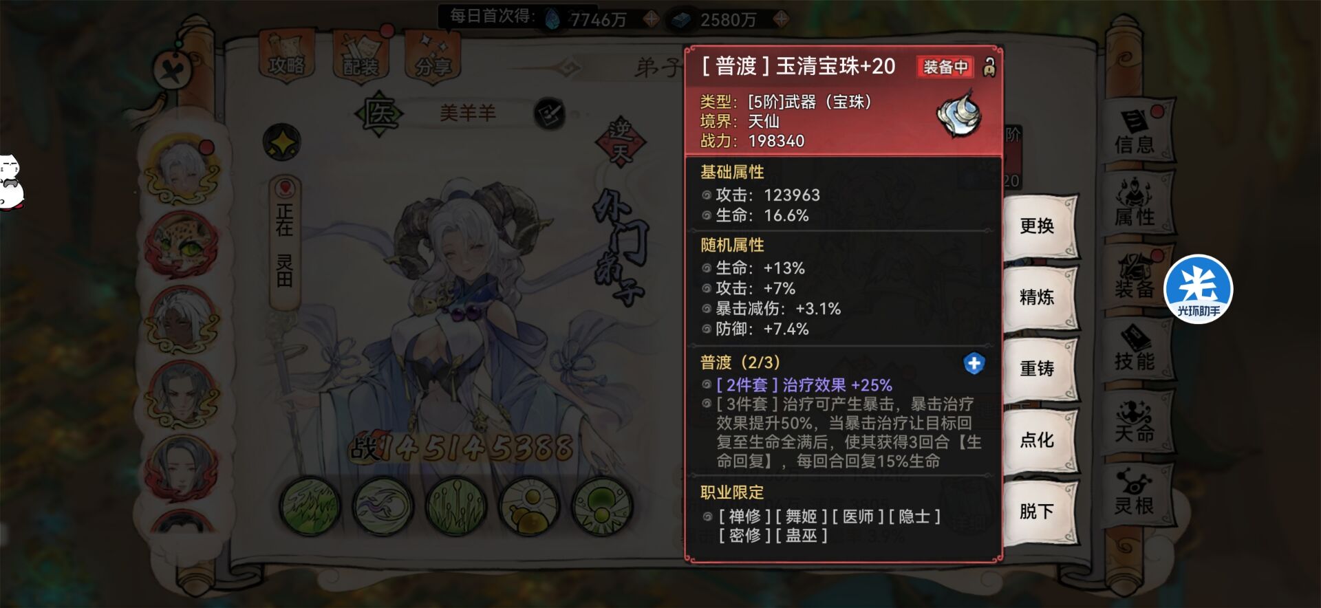 6:然后医家的【天道树】也可以增加额外的治疗效果,想推极限治疗量的朋友天道树也是必须拉的。