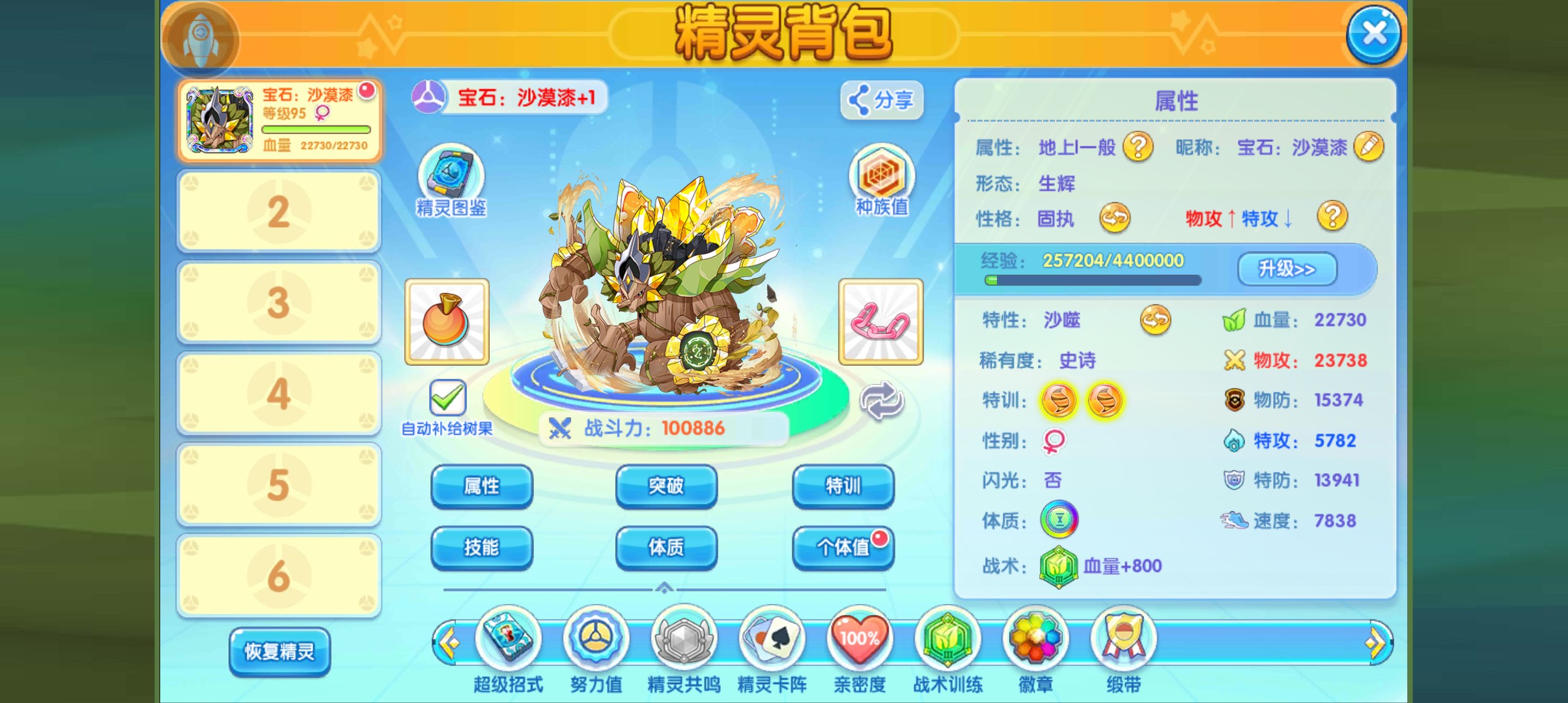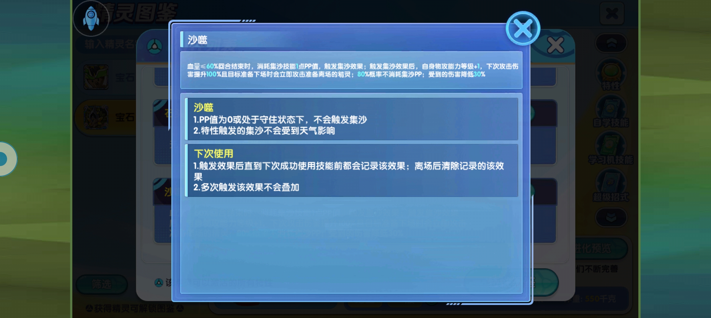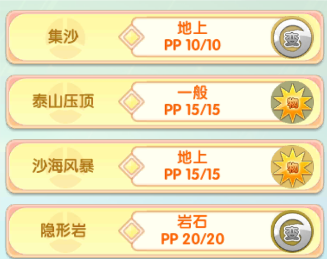 首先,核心技能在正式服上线的时候有一个漏洞,就是精灵现在已经可以在图鉴上面查到了,但是核心技能集沙还没有正式实装,没有这个技能的话,那这个特性将毫无用处,不过后续这个bug肯定会被修复的,请各位玩家别担心,这个技能是核心技能,主要作用就是回血和触发特性所以这个技能我就不多浪费口舌了,讲一下剩余的技能,首先一般属性输出技能,我是带了这个泰山压顶,因为这个技能它还有麻痹概率还是挺不错的,地上技能的话,我这边用的是这个沙海风暴,有必要的话,还是使用保护冲撞更好,因为那个技能还可以让自身增加防御能力,最后一个技能的话,可以像我一样使用障碍物,满地星和隐形岩,也可以考虑状态,比如说猛毒素这些,如果使用咒语的话那更好,因为使用咒语会让自身获得攻击加一和伤害翻倍的效果,因为使用咒语的那一个回合,自身会立马触发回血所以说这个精灵的玩法和之前的椰蛋树一样,可以考虑带咒语,咒语这个技能配这个精灵可以说是完美呀,不仅可以让对方不能够持续赖在场上,还可以让自身获得buff但是缺点就是道具方面的话就不要使用这个生命结晶了,而是使用这个回血的道具,因为对方的伤害一旦超过自身最大血量的50%,自身使用者咒语就当场濒死了,所以说有些时候不要先扔咒语,而是要观察自身能不能承受得住对方的伤害再说。