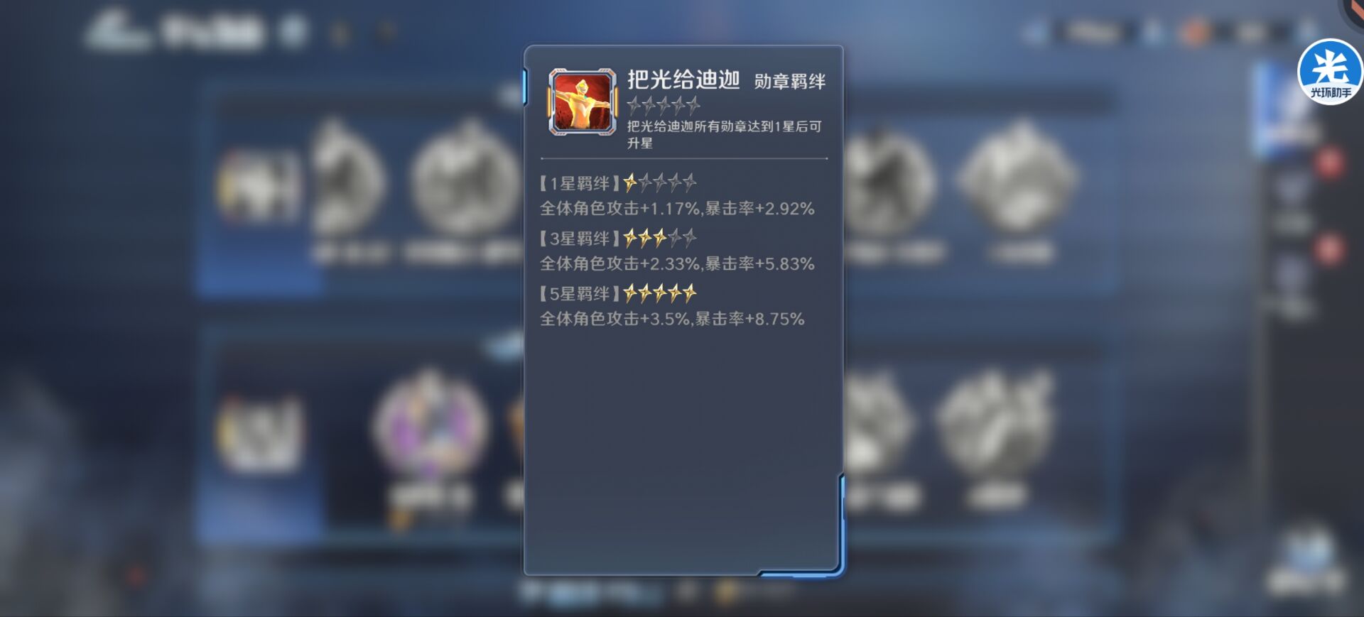 比如:【把光给我迪迦】羁绊属性可以提升全体角色大量的攻击和暴击,也是非常核心的勋章。