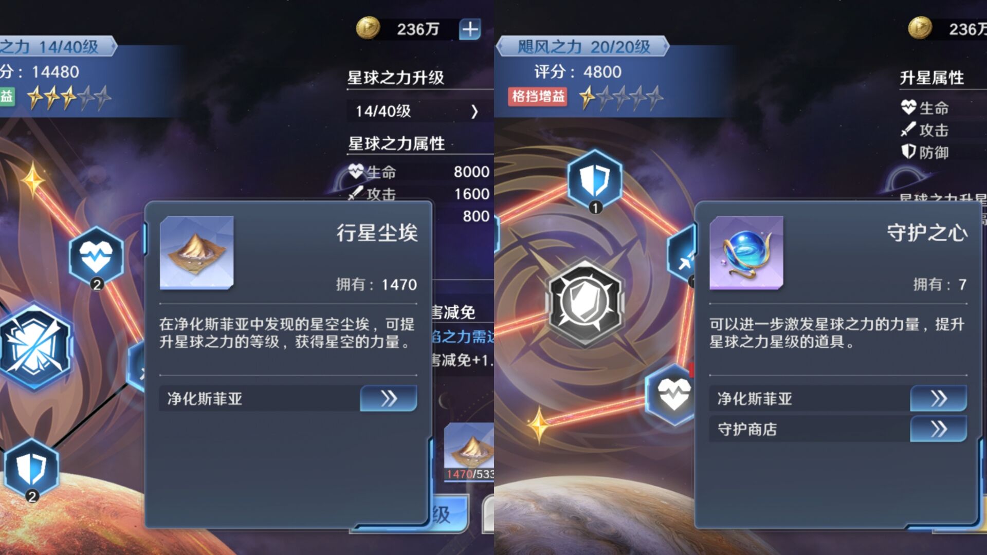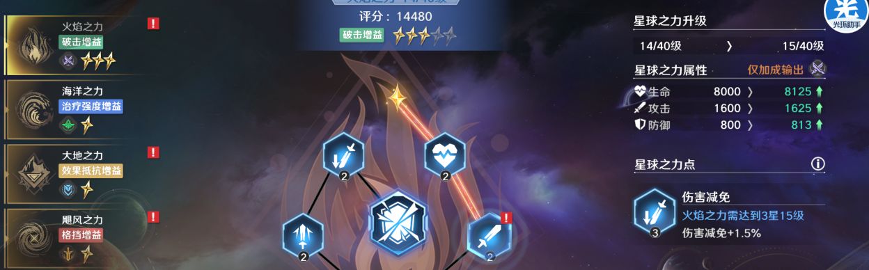因为升级需要的【行星尘埃】比较缺,升星需要的【守护之心】也缺,所以狮子自然认为是优先以【输出角色】加成的星球之力为主。