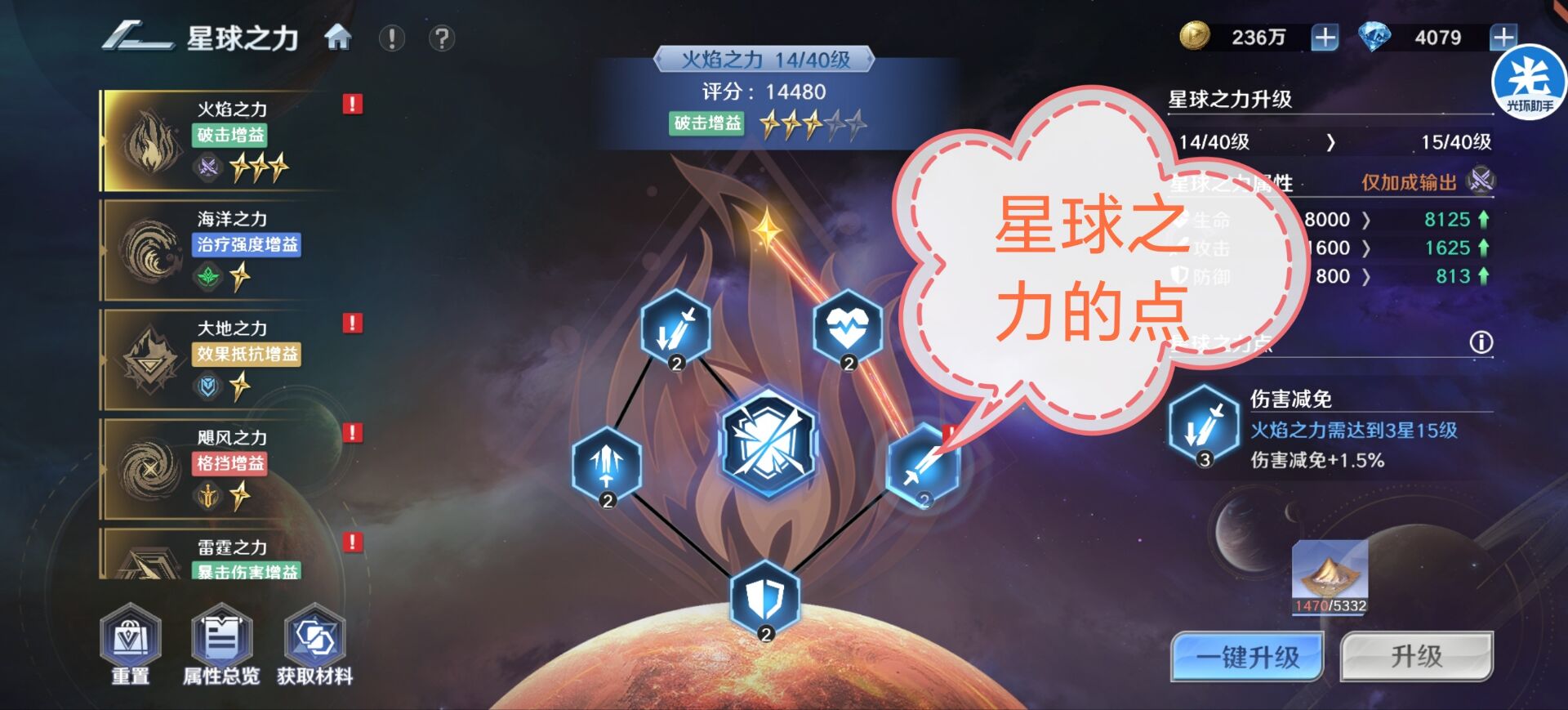 ④每个【星球之力】上面都有点可以进行升级每个点提供的增益加成也不同,狮子后面会讲