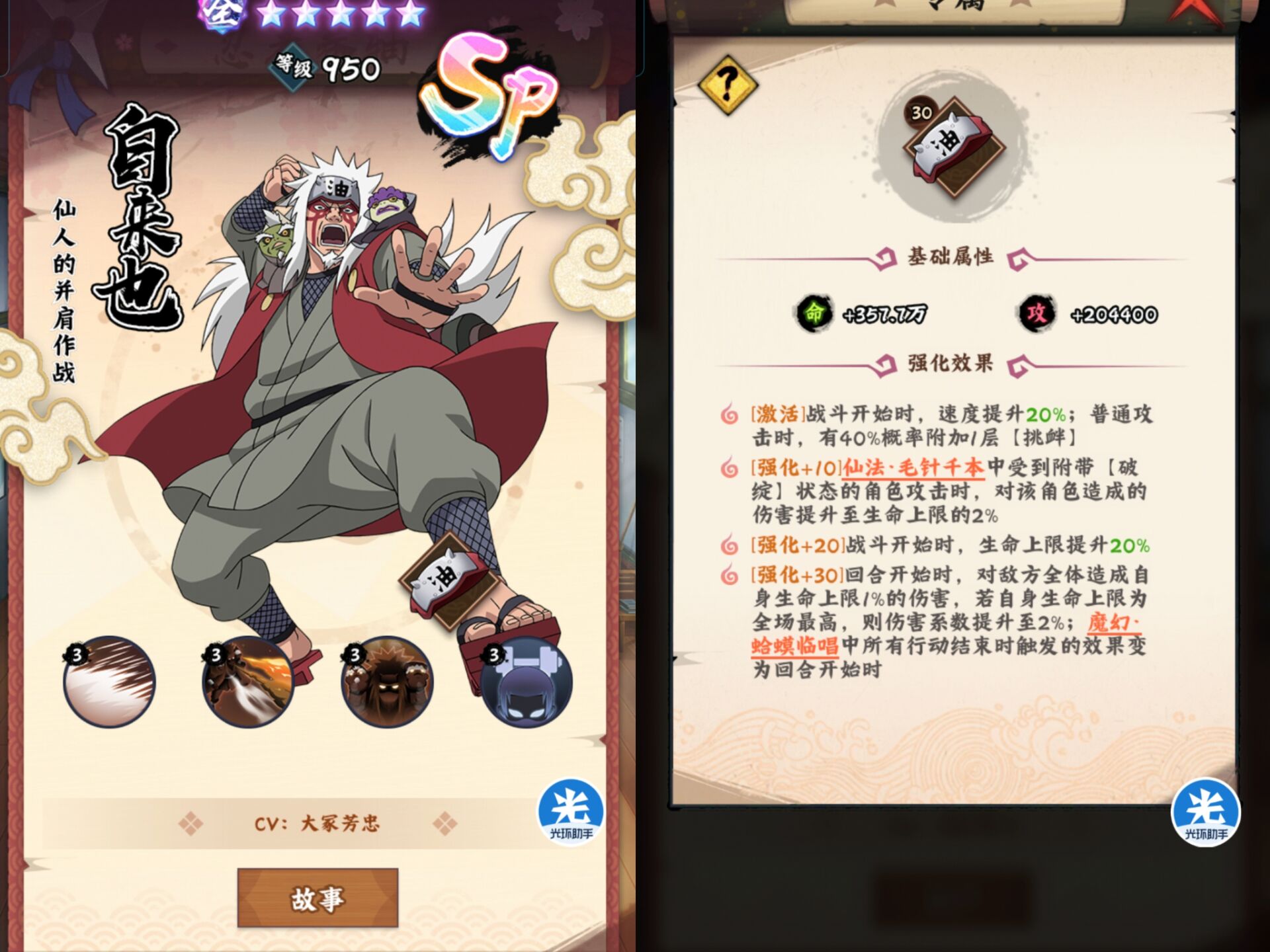 如果想玩好自来也,就必须得专属30级,因为38级以后被动机制全部改为【回合前】触发。
