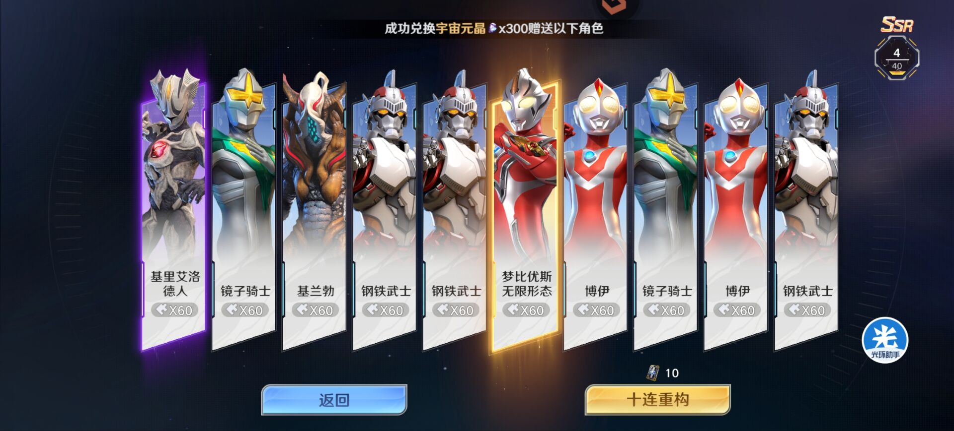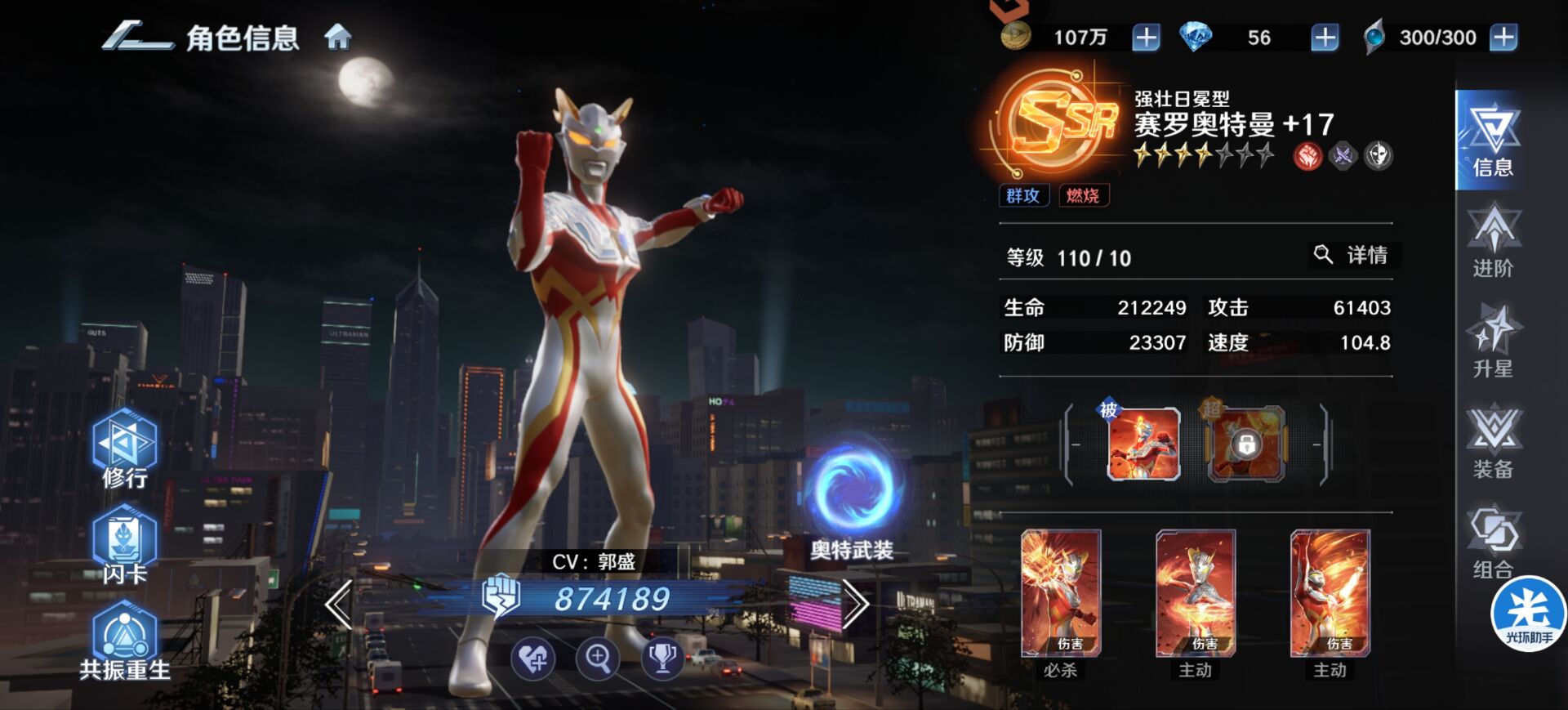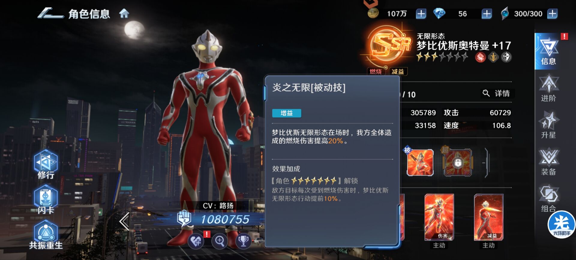 如果开局没有日冕赛罗快速挂灼烧的话,其实无限梦很难打出高伤害,而且对日冕赛罗的练度也有一些要求,打底也要Ur1星和3星起步这样去配合无限梦才有比较理想的效果。