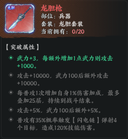 总的来说龙胆套装是游戏中顶级的输出套装,集输出、生存、控制于一体,尤其适合高频普攻型武将。成型后,每一次普攻都可能触发连锁闪电,清场和打坦能力极强,值得投入资源整套培养。但需注意,其威力依赖于普攻频率和武力达标,需要一定的启动时间,适合持久战。一旦成型则效果惊人。五件套齐备并全部5星后,【闪电链】将成为核心输出技能,具备以下特点:
