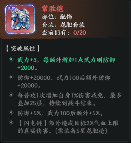 主提供防御加成与伤害减免。常胜铠与龙胆枪对应,突破至3星后可通过普攻叠加减伤,满层25%常驻减伤,极大提升坦度。突破至5星后可为闪电链附加目标最大生命2%的真实伤害,让闪电链打坦能力大幅提升,配合高频触发可快速削减坦克血量。