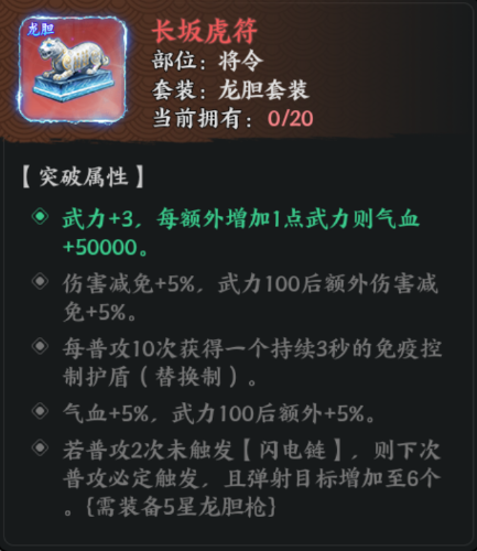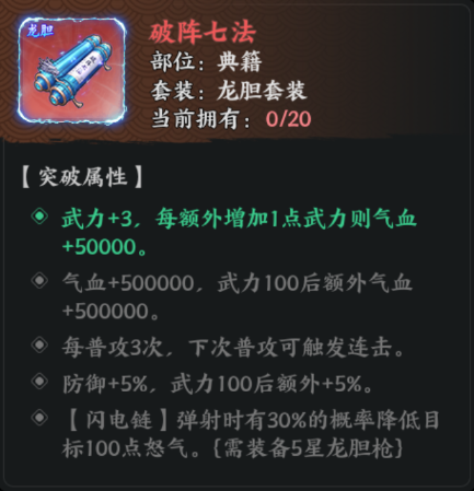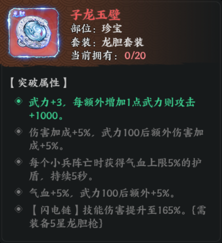 龙胆套装是一套以武力值为主的强力输出套装,包含五件宝物:龙胆枪(兵器)、常胜铠(配饰)、破阵七法(典籍)、子龙玉壁(珍宝)、长坂虎符(将令)。套装的核心输出机制是由龙胆枪提供的【闪电链】技能,其他四件宝物在升至5星并装备5星龙胆枪后可解锁强化效果,大幅提升【闪电链】的伤害、控制能力和触发稳定性。堆叠武力至100以上是发挥套装价值的关键,同时普攻频率是驱动整套体系的核心动力。